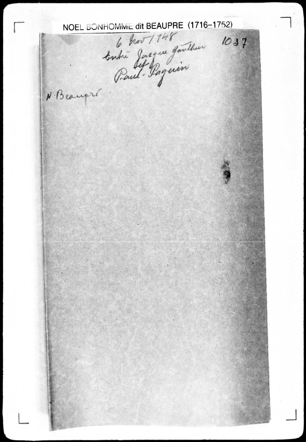Procès-verbal de chaînage et bornes de la profondeur de deux terres situées au second rang de la seigneurie de Deschambault. La présente pièce concerne directement: Paul Paquin; Jacques Gautier (Gauthier) (arpenteur Noël Bonhomme dit Beaupré), 6 novembre 1748, Archives nationales à Québec, Fonds Cour supérieure. District judiciaire de Québec. Greffes d'arpenteurs, (03Q,CA301,S2,P1094).