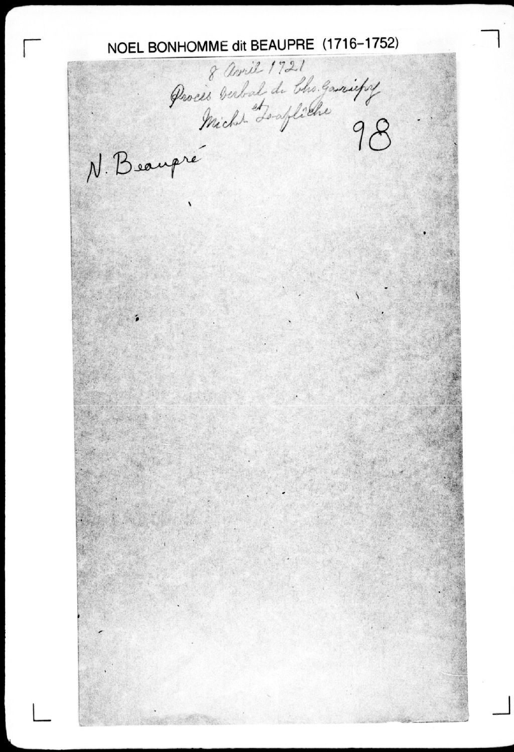 Procès-verbal de chaînage, lignes et bornes de deux terres situées dans la [seigneurie de Sainte-Anne-de-la-Pérade]. La présente pièce concerne directement: Michel Laflèche; Charles Gariépy (arpenteur Noël Bonhomme dit Beaupré), 8 avril 1721, Archives nationales à Québec, Fonds Cour supérieure. District judiciaire de Québec. Greffes d'arpenteurs, (03Q,CA301,S2,P110).