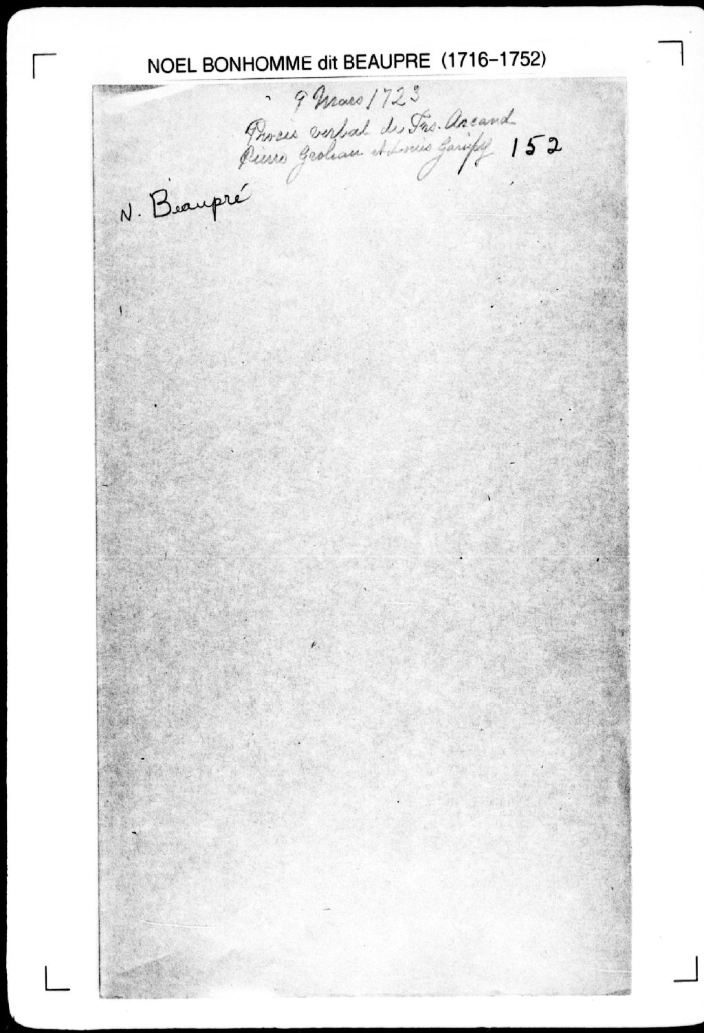 Procès-verbal de ligne et bornes séparant deux terres situées dans la seigneurie de La Chevrotière. La présente pièce concerne directement: Simon Arcan (père) (Arcand); François Arcan (fils) (Arcand) (arpenteur Noël Bonhomme dit Beaupré), 9 mars 1723, Archives nationales à Québec, Fonds Cour supérieure. District judiciaire de Québec. Greffes d'arpenteurs, (03Q,CA301,S2,P171).