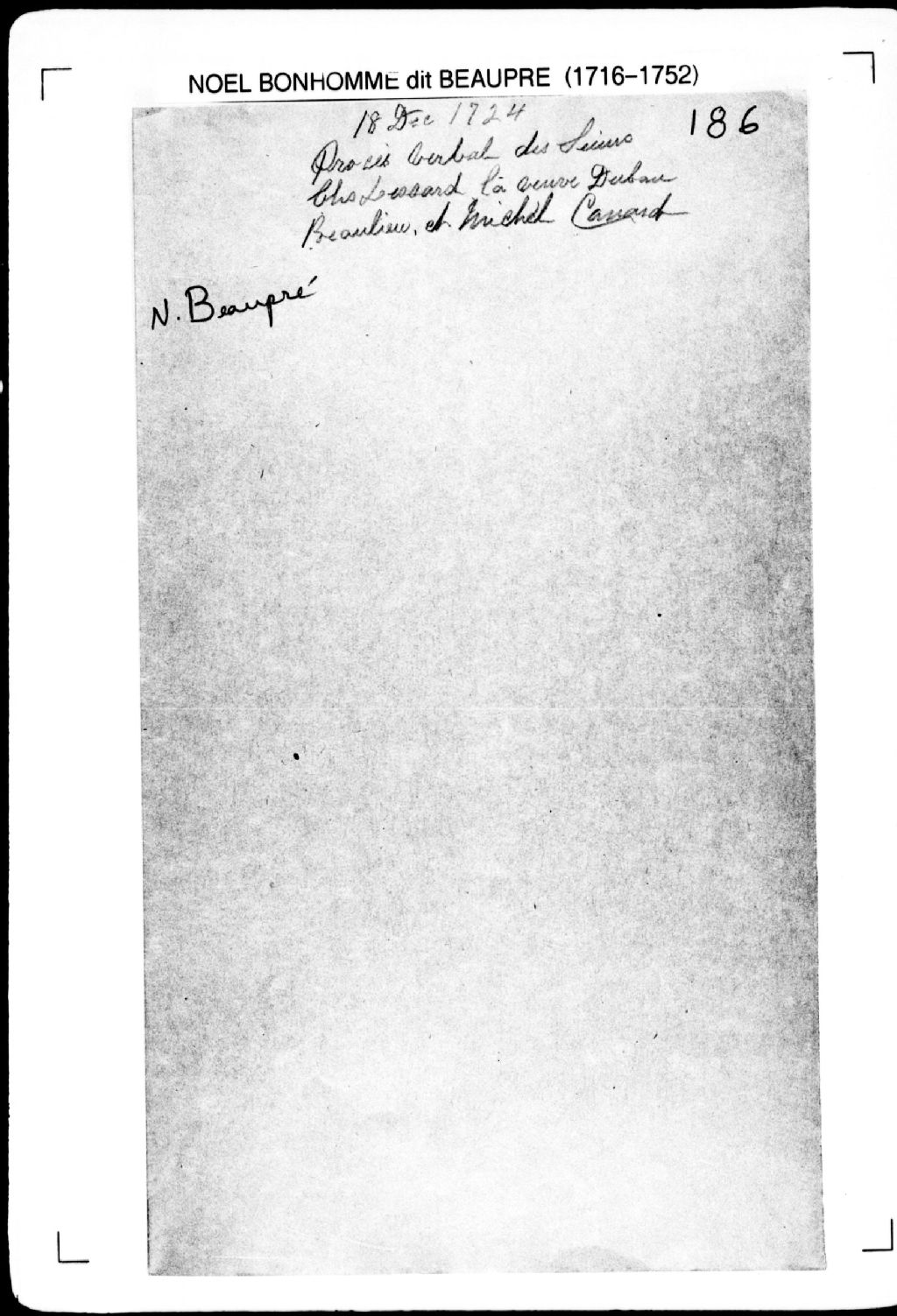 Procès-verbal de chaînage, lignes et bornes de quatre terres situées à la Misère. La présente pièce concerne directement: Charles Lessard; la veuve Dubau (Dubeau); le sieur Beaulieu; Michel Canard (arpenteur Noël Bonhomme dit Beaupré), 18 décembre 1724, Archives nationales à Québec, Fonds Cour supérieure. District judiciaire de Québec. Greffes d'arpenteurs, (03Q,CA301,S2,P209).