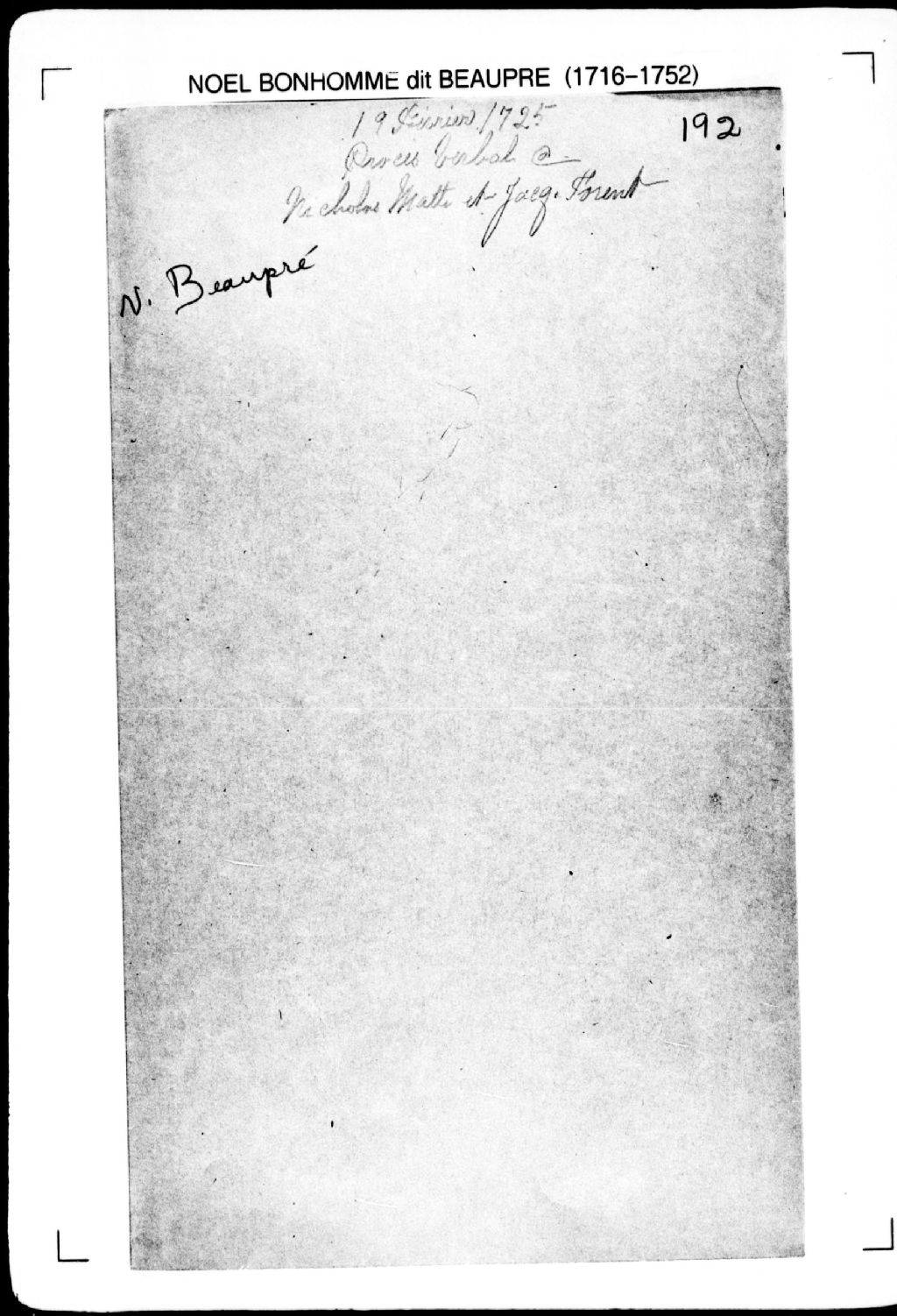 Procès-verbal de bornes séparant deux terres bornées situées au village de Saint-Jean, seigneurie de Neuville. La présente pièce concerne directement: Nicolas Matte; Jacques Fornel (Fournel) (arpenteur Noël Bonhomme dit Beaupré), 17 février 1725, Archives nationales à Québec, Fonds Cour supérieure. District judiciaire de Québec. Greffes d'arpenteurs, (03Q,CA301,S2,P215).