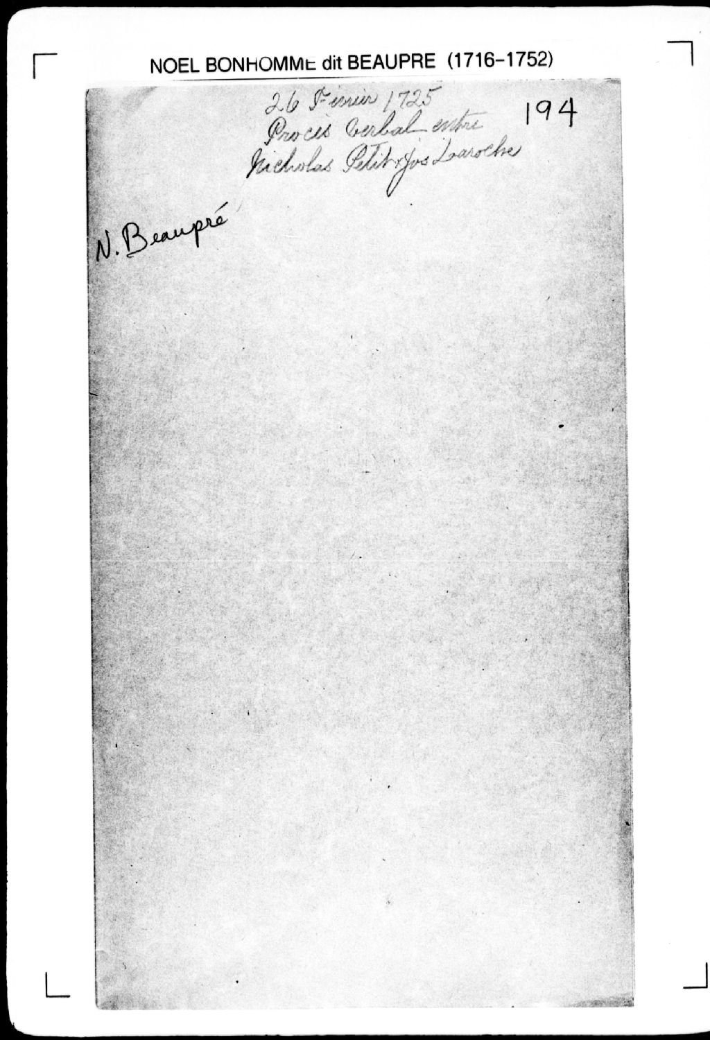 Procès-verbal de chaînage, lignes et bornes de trois terres situées au village de L'Enfant-Jésus, [seigneurie de Neuville]. La présente pièce concerne directement: Nicolas Petit; François Laroche; Jean Chayé (Chaillé) (arpenteur Noël Bonhomme dit Beaupré), 26 février 1725, Archives nationales à Québec, Fonds Cour supérieure. District judiciaire de Québec. Greffes d'arpenteurs, (03Q,CA301,S2,P217).
