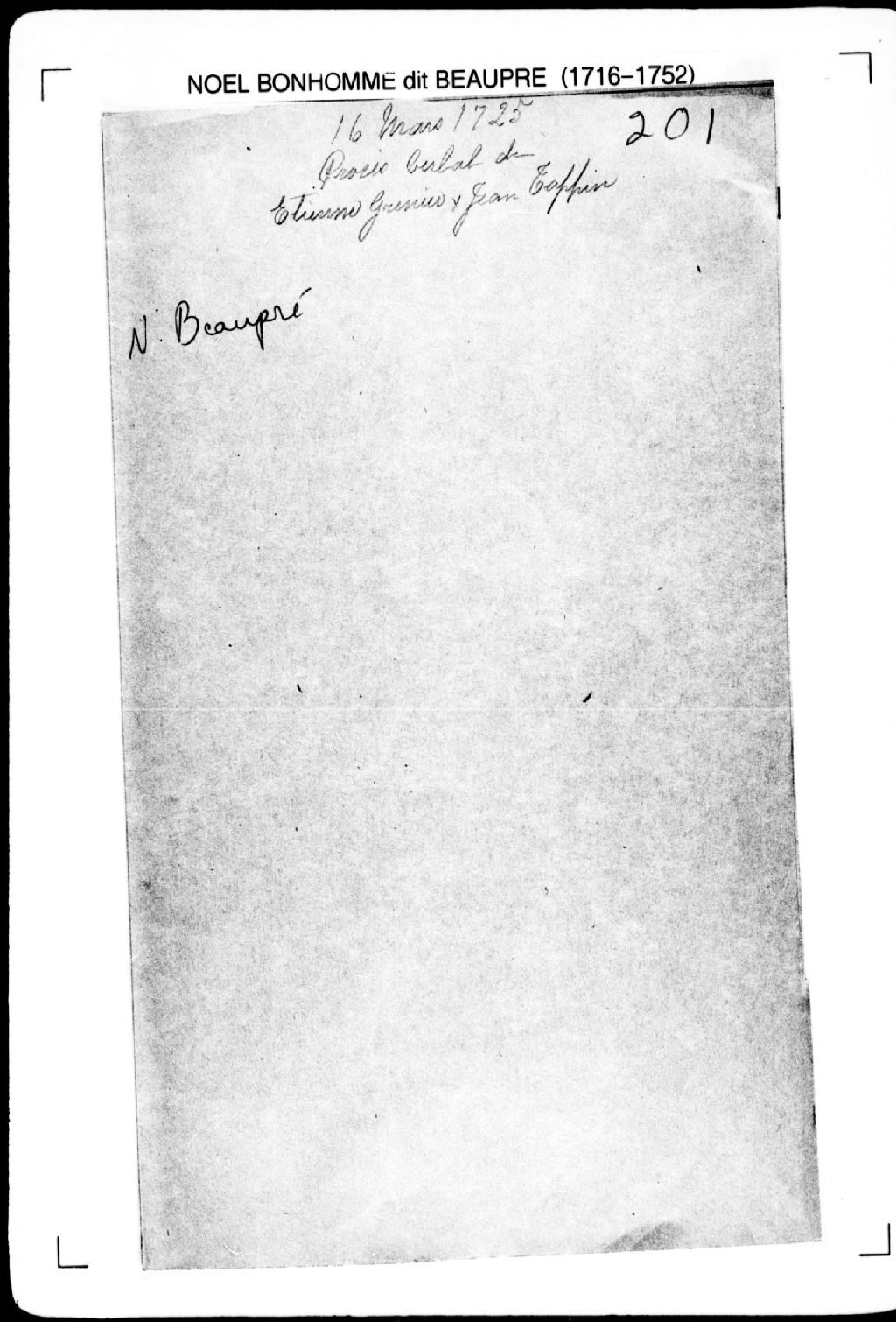 Procès-verbal de ligne et bornes séparant deux terres situées à la seconde concession de la seigneurie de Neuville. La présente pièce concerne directement: Étienne Grenier; Jean Tappin (Tapin) (arpenteur Noël Bonhomme dit Beaupré), 16 mars 1725, Archives nationales à Québec, Fonds Cour supérieure. District judiciaire de Québec. Greffes d'arpenteurs, (03Q,CA301,S2,P226).