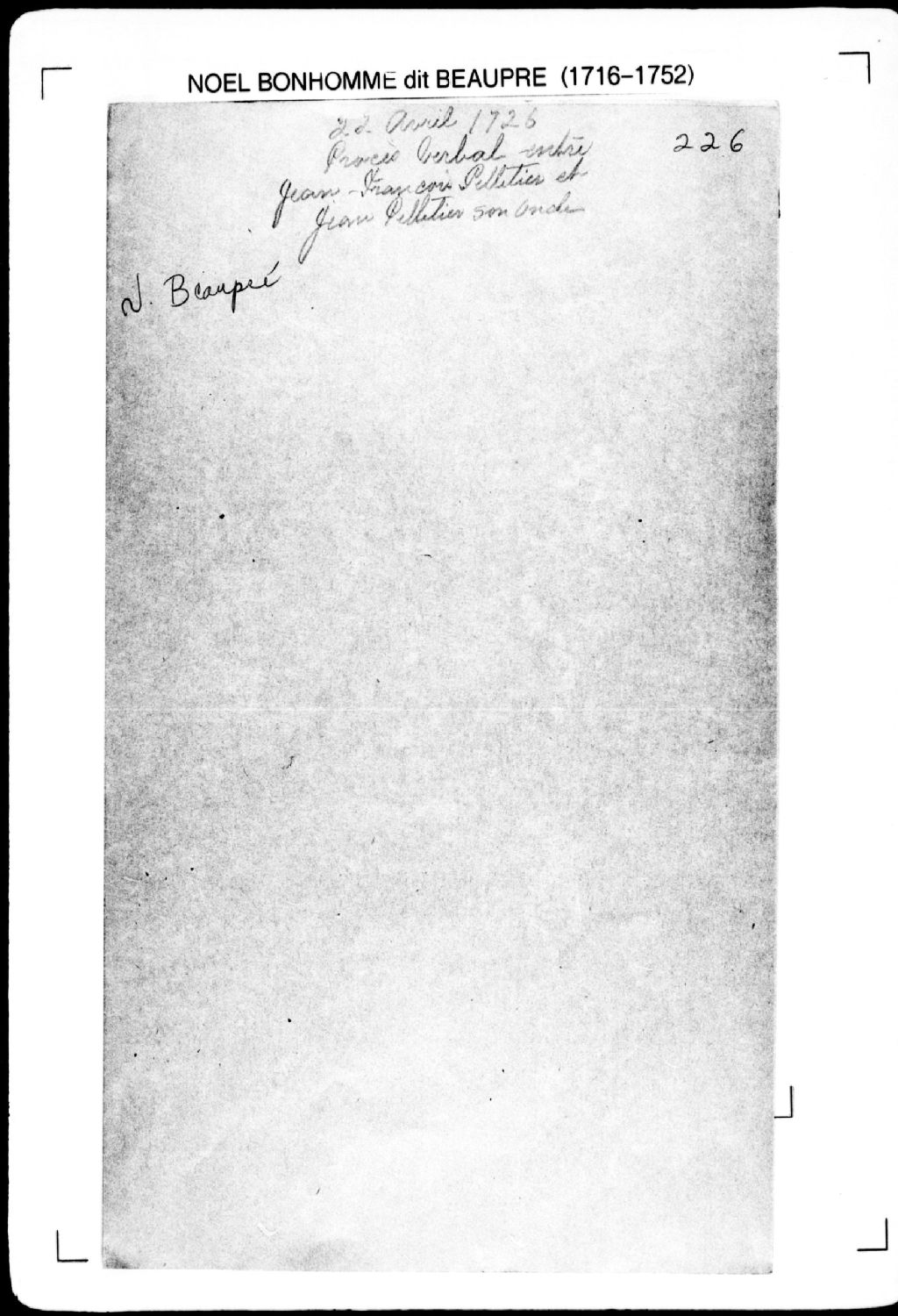 Procès-verbal de ligne et bornes séparant deux terres situées à partir des bornes entre le sieur d'Auteuil (seigneurie de la Grande-Anse) et le sieur de Gaspé [seigneurie de Port-Joly], dans la seigneurie de la Grande-Anse. La présente pièce concerne directement: Jean-François Peltier (Pelletier), habitant de la Grande-Anse, neveu de Jean Pelletier; Jean Peltier (Pelletier), oncle de Jean-François Pelletier (arpenteur Noël Bonhomme dit Beaupré), 22 avril 1726, Archives nationales à Québec, Fonds Cour supérieure. District judiciaire de Québec. Greffes d'arpenteurs, (03Q,CA301,S2,P255).