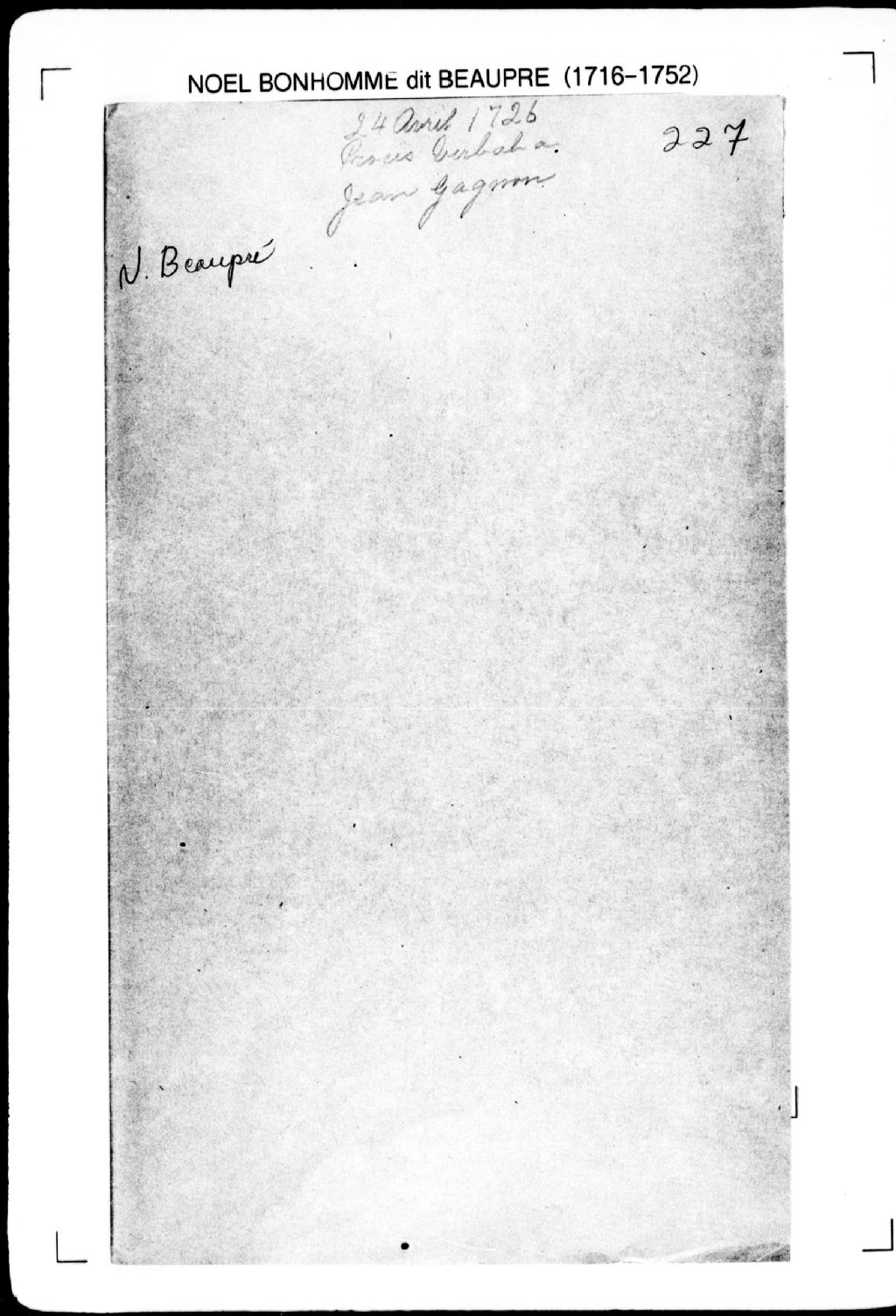 Procès-verbal de lignes et bornes de deux terres situées à la Grande-Pointe, seigneurie de Saint-Roch-des-Aulnaies [seigneurie de la Grande-Anse]. La présente pièce concerne directement: Jean Gagnon, habitant de la Grande-Pointe; la terre du domaine (arpenteur Noël Bonhomme dit Beaupré), 24 avril 1726, Archives nationales à Québec, Fonds Cour supérieure. District judiciaire de Québec. Greffes d'arpenteurs, (03Q,CA301,S2,P256).