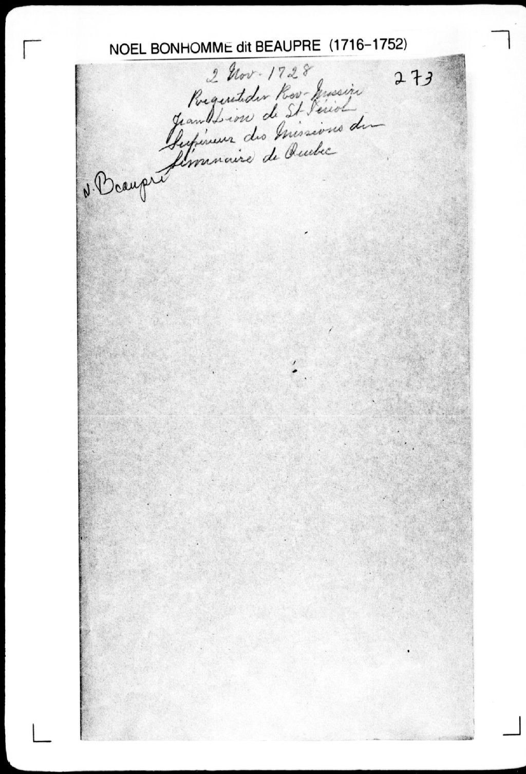 Procès-verbal de chaînage, ligne et bornes de trente et une terres situées à la Grande-Rivière, au-dessus de la grande Rivière du côté du nord, au village de Saint-Ferréol, [seigneurie de la Côte-de-Beaupré]. La présente pièce concerne directement: le Séminaire de Québec (arpenteur Noël Bonhomme dit Beaupré), 2 novembre 1728, Archives nationales à Québec, Fonds Cour supérieure. District judiciaire de Québec. Greffes d'arpenteurs, (03Q,CA301,S2,P306).