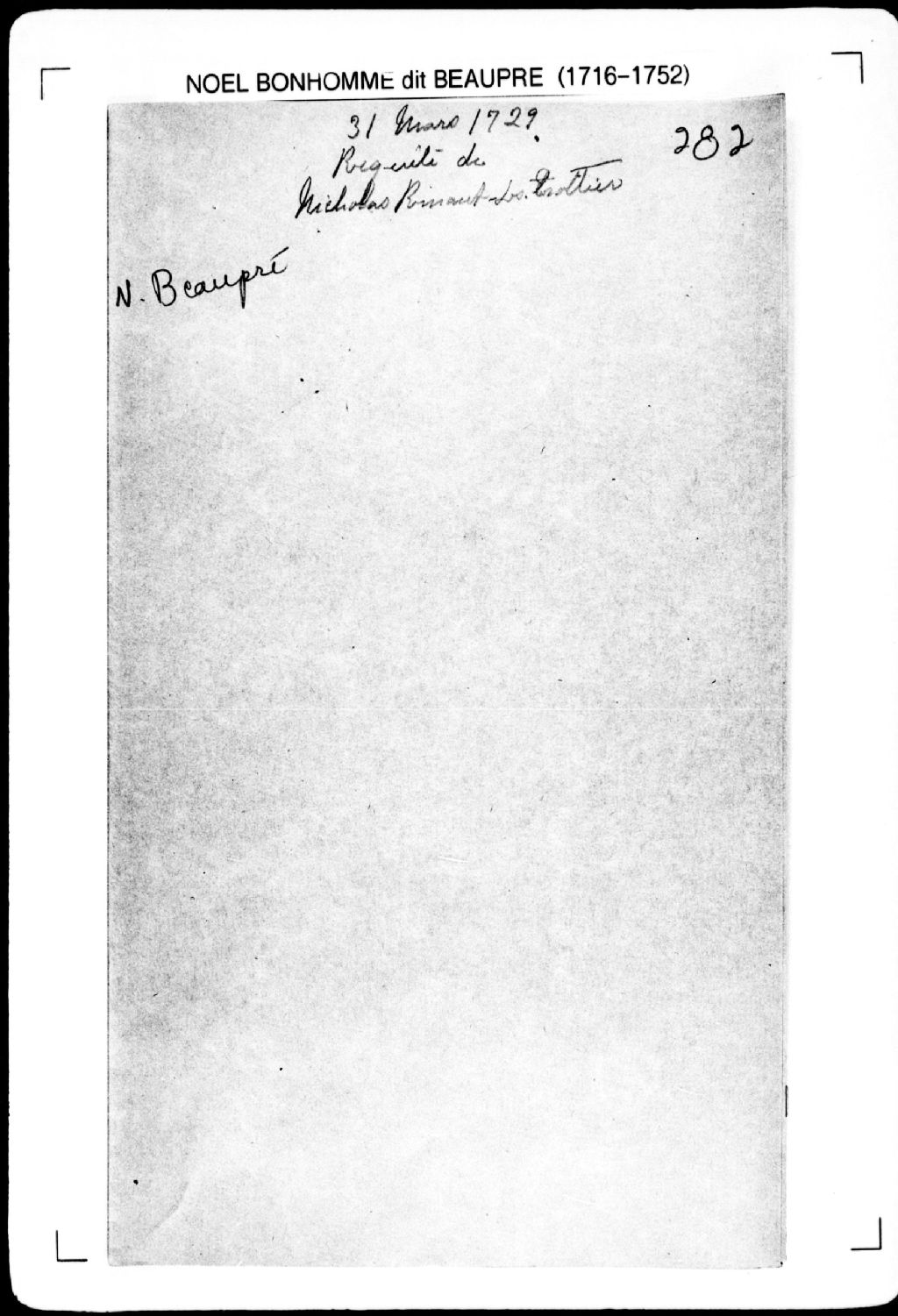 Procès-verbal de ligne et bornes séparant deux terres situées dans la seigneurie des Grondines. La présente pièce concerne directement: Nicolas Rivard; Louis Trottier (arpenteur Noël Bonhomme dit Beaupré), 31 mars 1729, Archives nationales à Québec, Fonds Cour supérieure. District judiciaire de Québec. Greffes d'arpenteurs, (03Q,CA301,S2,P315).