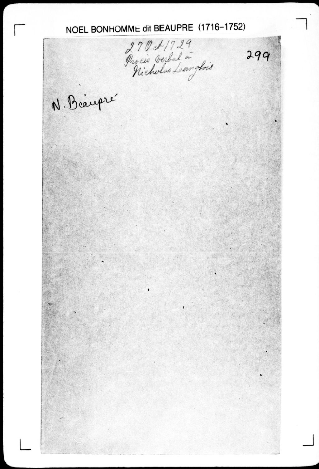 Procès-verbal de chaînage d'une terre. La présente pièce concerne directement: Nicolas Langlois, gendre de sieur Culerrier (Cuillerier) (arpenteur Noël Bonhomme dit Beaupré), 27 octobre 1729, Archives nationales à Québec, Fonds Cour supérieure. District judiciaire de Québec. Greffes d'arpenteurs, (03Q,CA301,S2,P333).