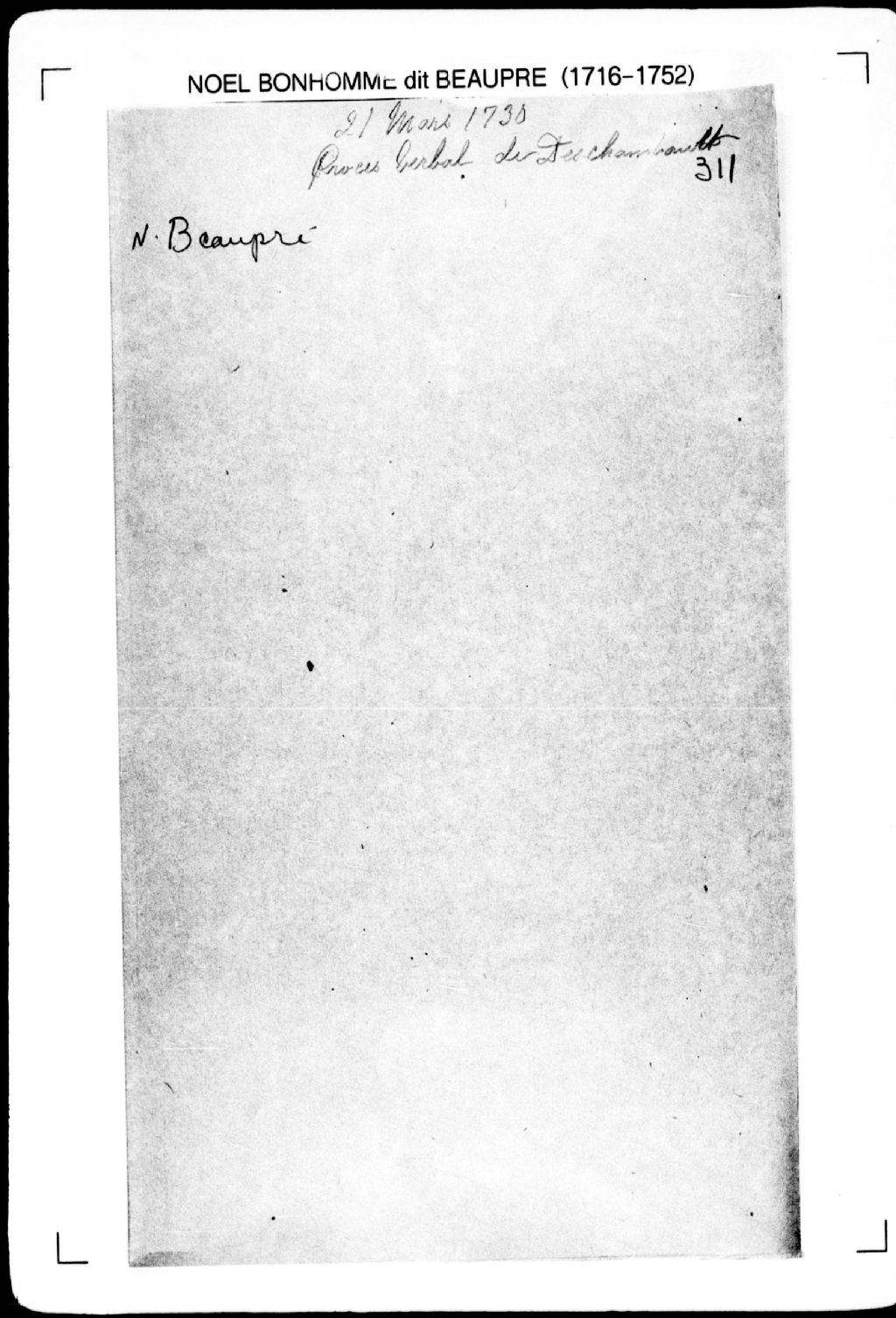 Procès-verbal de chaînage, lignes et bornes de trois terres situées à la deuxième concession de la seigneurie de Deschambault (arpenteur Noël Bonhomme dit Beaupré), 21 mars 1730, Archives nationales à Québec, Fonds Cour supérieure. District judiciaire de Québec. Greffes d'arpenteurs, (03Q,CA301,S2,P345).