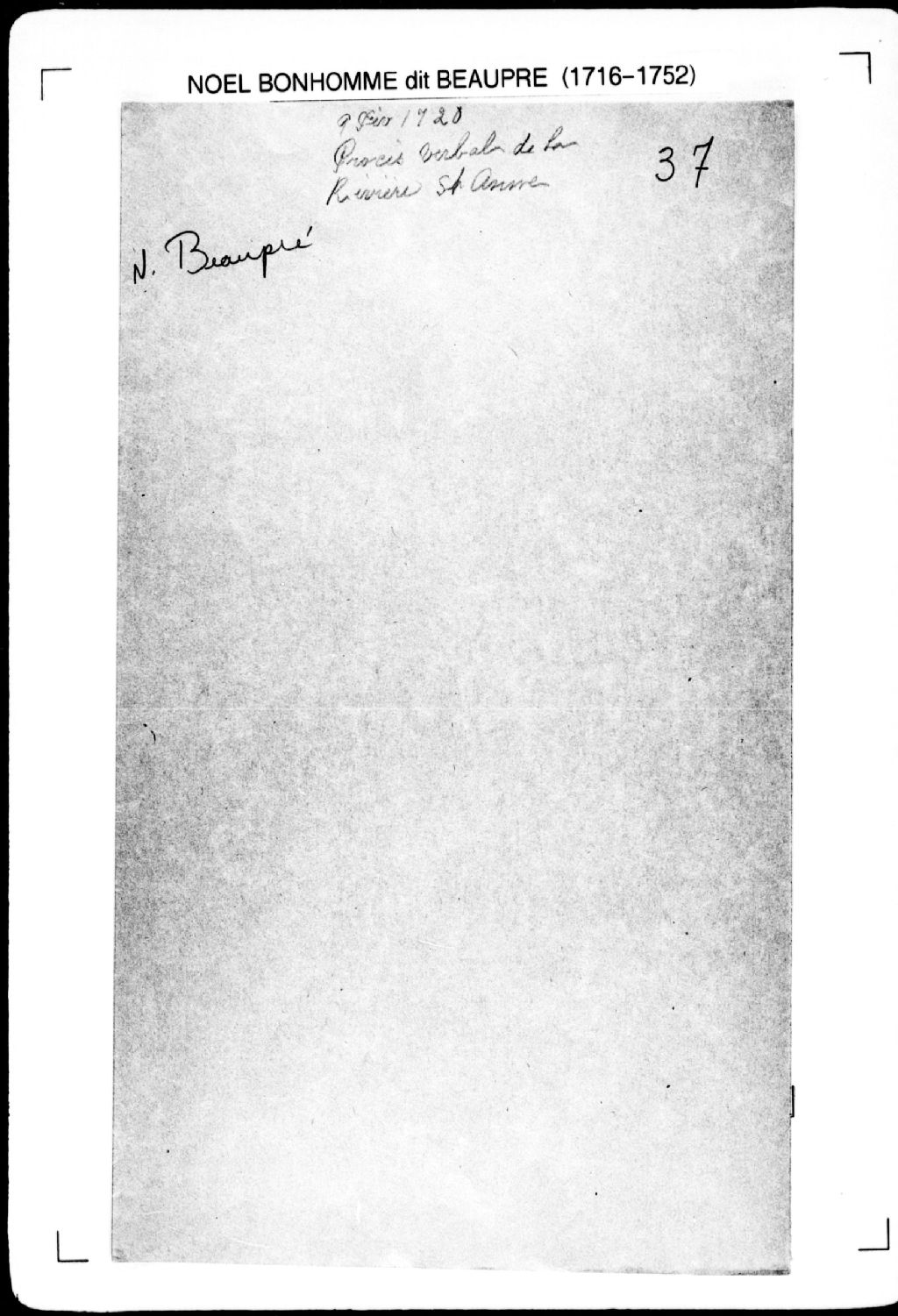Procès-verbal de chaînage, lignes et bornes de quatre terres situées le long de la rivière Sainte-Anne, [seigneurie de Sainte-Anne-de-la-Pérade]. La présente pièce concerne directement: Louis Masson; François Goulet; Jean-Baptiste Arnaud, curé de Sainte-Anne-des-Grondines; le presbytère de Sainte-Anne-des-Grondines (arpenteur Noël Bonhomme dit Beaupré), 9 février 1720, Archives nationales à Québec, Fonds Cour supérieure. District judiciaire de Québec. Greffes d'arpenteurs, (03Q,CA301,S2,P39).