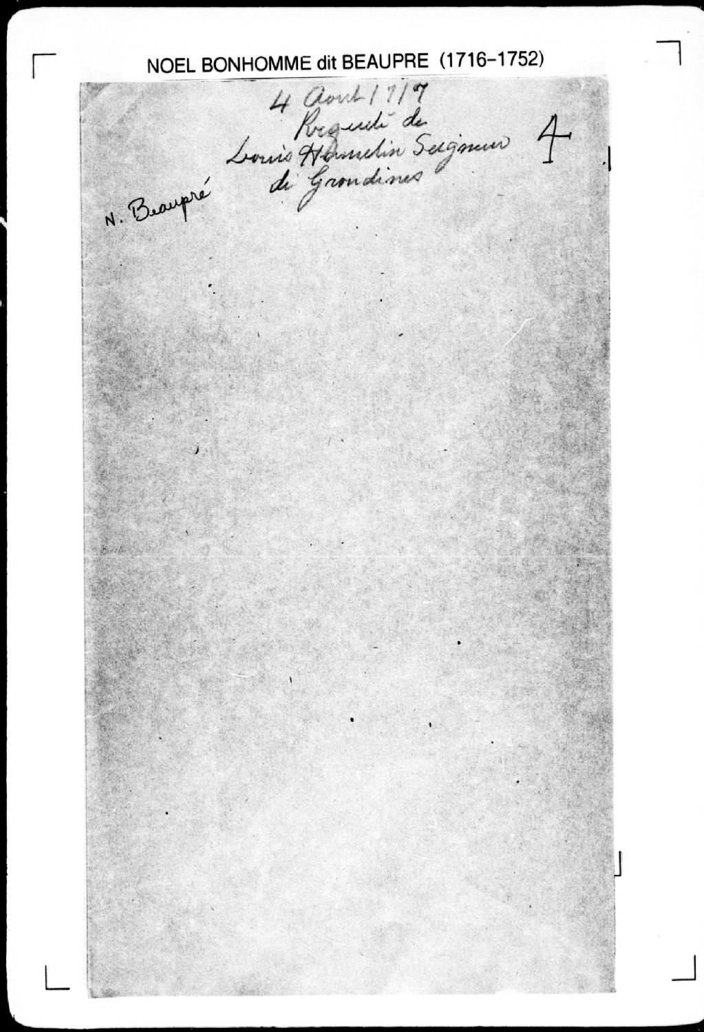 Procès-verbal de chaînage, lignes et bornes de cinq terres situées dans la seigneurie des Grondines. La présente pièce concerne directement: Jean-Baptiste Grignon; Jacques Grignon; François Gipoulou; Joseph Gipoulou; Pierre Brunet (arpenteur Noël Bonhomme dit Beaupré), 4 août 1717, Archives nationales à Québec, Fonds Cour supérieure. District judiciaire de Québec. Greffes d'arpenteurs, (03Q,CA301,S2,P4).