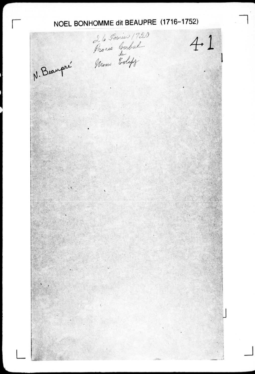 Procès-verbal de ligne et bornes séparant deux terres situées à la rivière Maskinongé, seigneurie de Maskinongé. La présente pièce concerne directement: Joseph Petit Bruno (Bruneau), seigneur de Maskinongé; François Dupuy (Dupuis) (arpenteur Noël Bonhomme dit Beaupré), 26 février 1720, Archives nationales à Québec, Fonds Cour supérieure. District judiciaire de Québec. Greffes d'arpenteurs, (03Q,CA301,S2,P43).