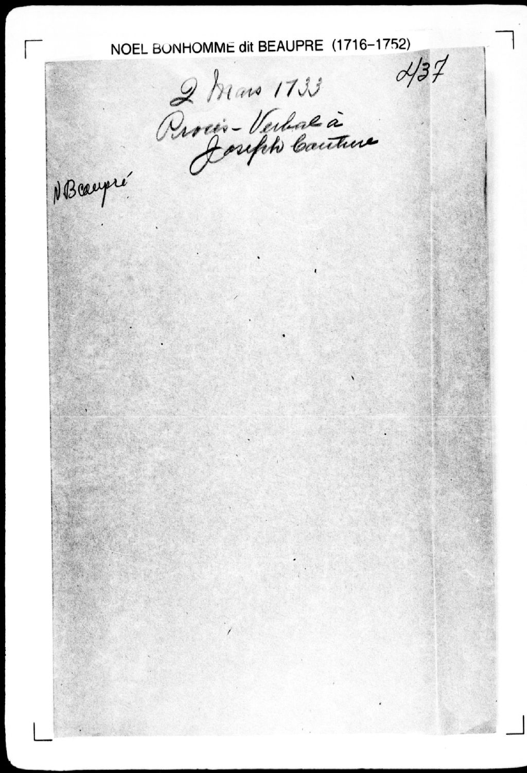 Procès-verbal de chaînage, lignes et bornes de trois terres situées dans la seigneurie de Beaumont. La présente pièce concerne directement: Joseph Couture; Jacques Guay; le sieur de Beaumont (arpenteur Noël Bonhomme dit Beaupré), 2 mars 1733, Archives nationales à Québec, Fonds Cour supérieure. District judiciaire de Québec. Greffes d'arpenteurs, (03Q,CA301,S2,P481).