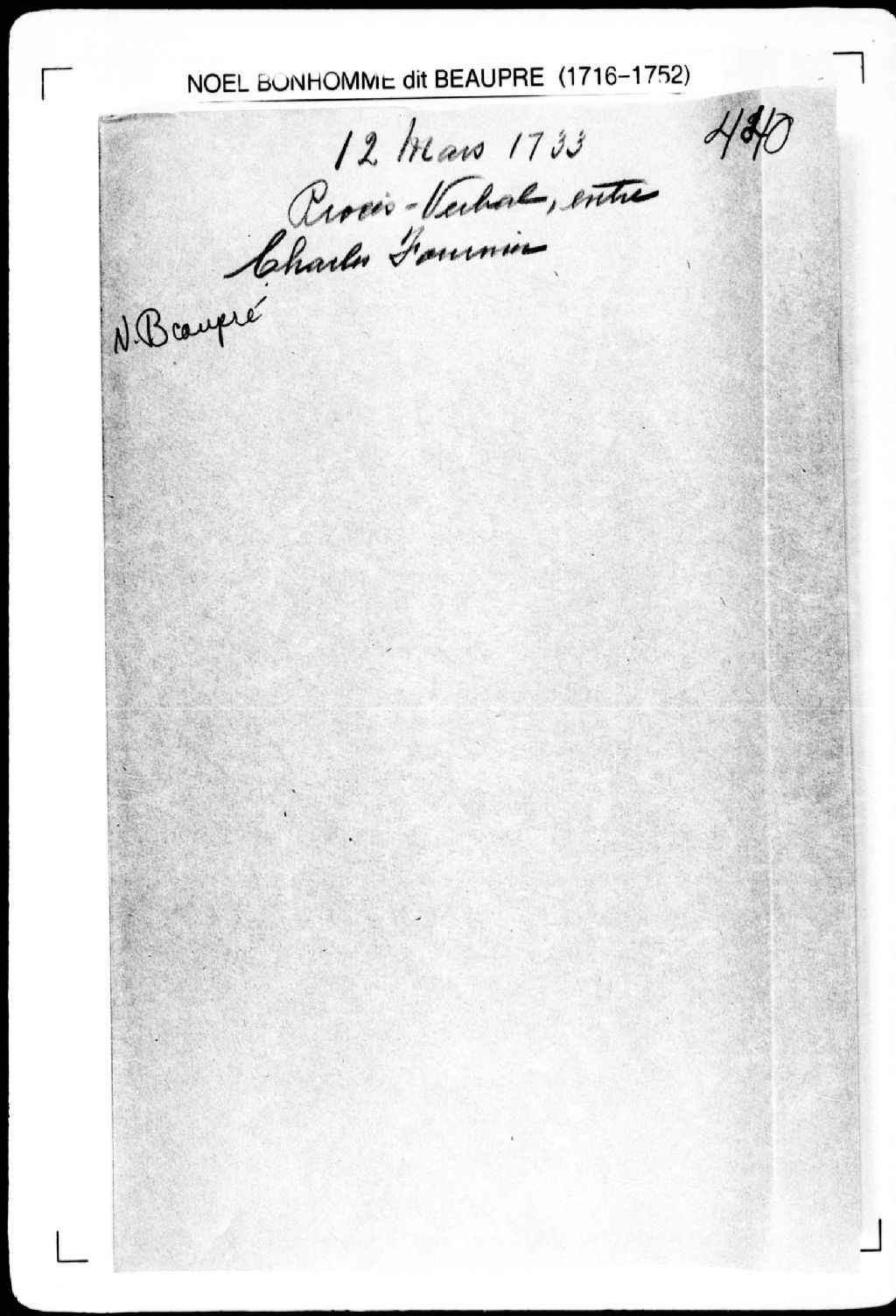 Procès-verbal de ligne séparant deux terres situées à la pointe à Lacaille, [seigneurie de la Rivière-du-Sud]. La présente pièce concerne directement: Charles Fournier, habitant de la pointe à Lacaille; les représentants de feu Jean Letournaux (Létourneau) (arpenteur Noël Bonhomme dit Beaupré), 12 mars 1733, Archives nationales à Québec, Fonds Cour supérieure. District judiciaire de Québec. Greffes d'arpenteurs, (03Q,CA301,S2,P484).