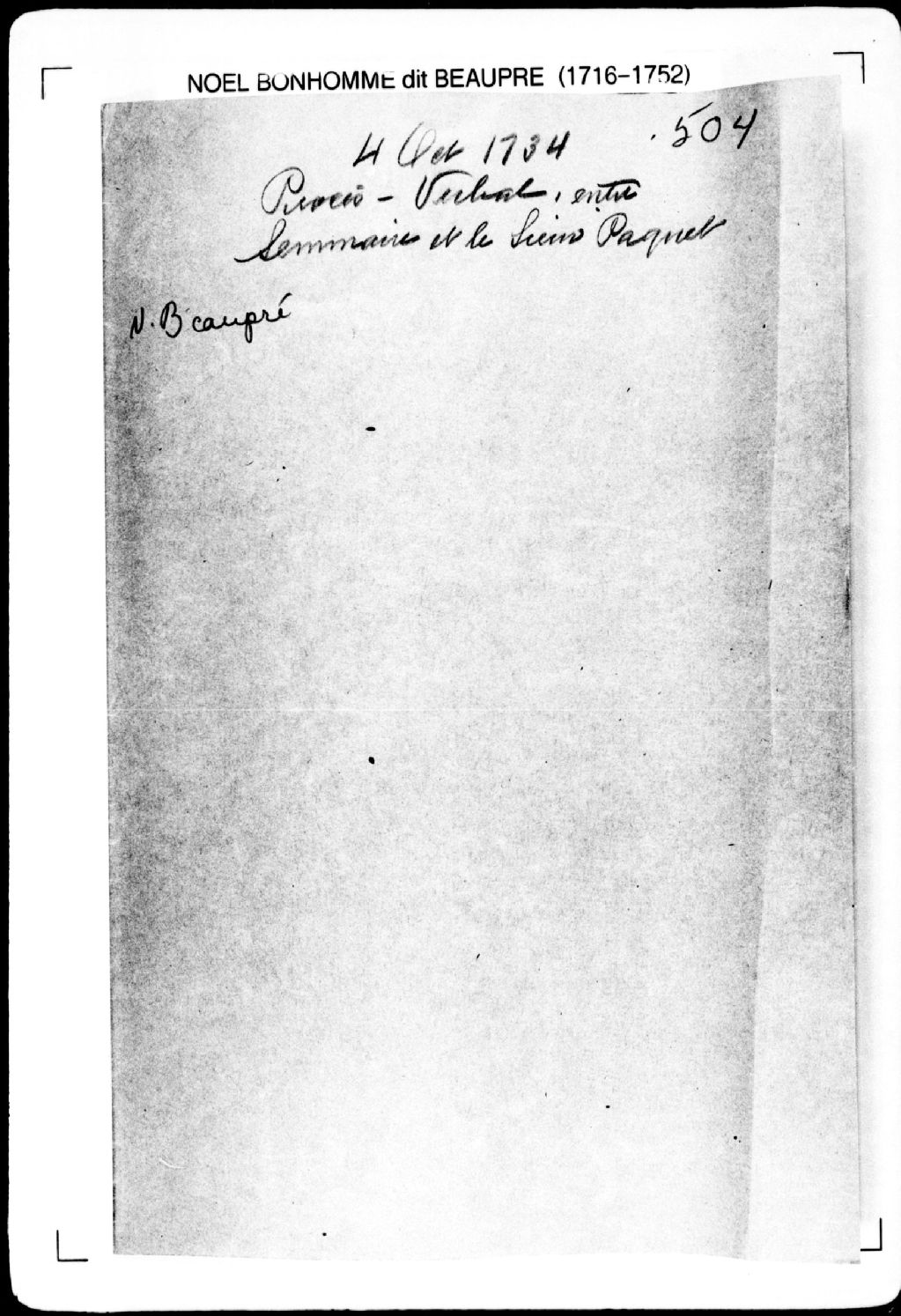 Procès-verbal de chaînage et borne d'une terre située à La Canardière et au Petit-Village, dans la [paroisse de Charlesbourg], [seigneurie de Notre-Dame-des-Anges]. La présente pièce concerne directement: les sieurs du Séminaire de Québec (arpenteur Noël Bonhomme dit Beaupré), 4 octobre 1734, Archives nationales à Québec, Fonds Cour supérieure. District judiciaire de Québec. Greffes d'arpenteurs, (03Q,CA301,S2,P548).