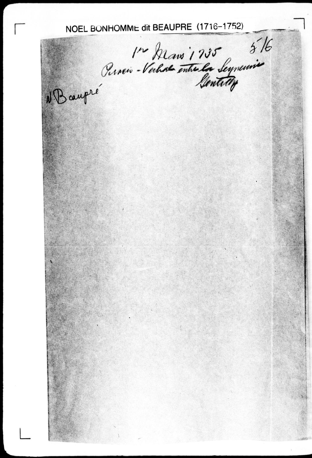 Procès-verbal de ligne et bornes séparant la seigneurie de Gentilly et la seigneurie de Levrard sur le fleuve Saint-Laurent, près de la rivière aux Orignaux, à partir de la seigneurie de Cournoyer. La présente pièce concerne directement: la dame Poisson, seigneuresse en partie de la seigneurie de Gentilly, soeur du sieur Disy (Dizy); les sieurs Baudoin (Baudouin, Beaudoin), seigneurs en partie de la seigneurie de Gentilly; le sieur Levrard (arpenteur Noël Bonhomme dit Beaupré), 1er mars 1735, Archives nationales à Québec, Fonds Cour supérieure. District judiciaire de Québec. Greffes d'arpenteurs, (03Q,CA301,S2,P560).