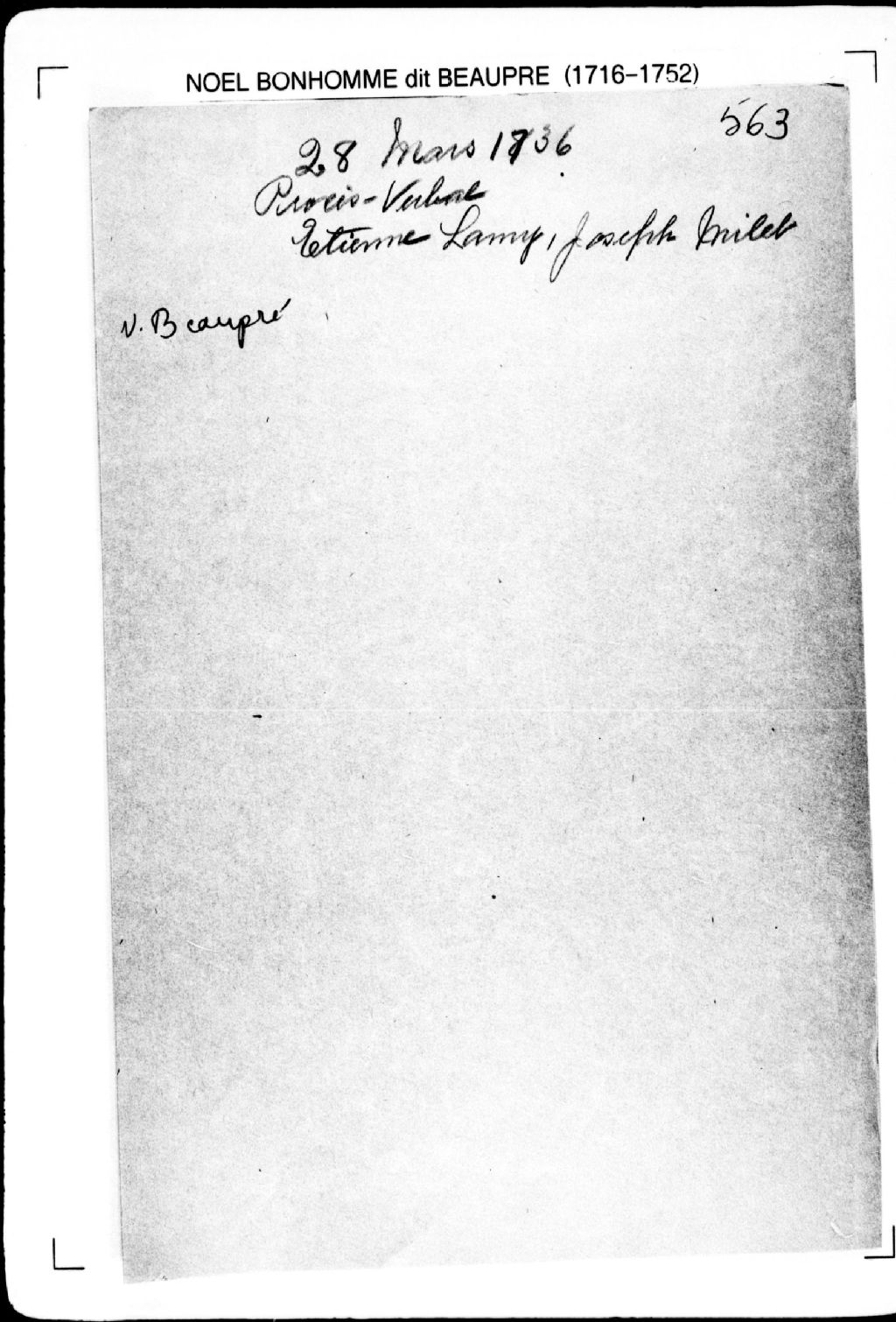 Procès-verbal de chaînage, lignes et bornes de quatre terres situées du côté nord de la rivière Yamachiche (pour les terres de Lamy et de Milet), du côté sud de la rivière Yamachiche (pour les terres de LeSieur et de Gélinas), dans la seigneurie de Yamachiche [seigneurie de Grosbois]. La présente pièce concerne directement: Étienne Lamy; Joseph Milet (Millet); Augustin Le Sieur (Lesieur); Antoine Gélinas (arpenteur Noël Bonhomme dit Beaupré), 28 mars 1736, Archives nationales à Québec, Fonds Cour supérieure. District judiciaire de Québec. Greffes d'arpenteurs, (03Q,CA301,S2,P607).
