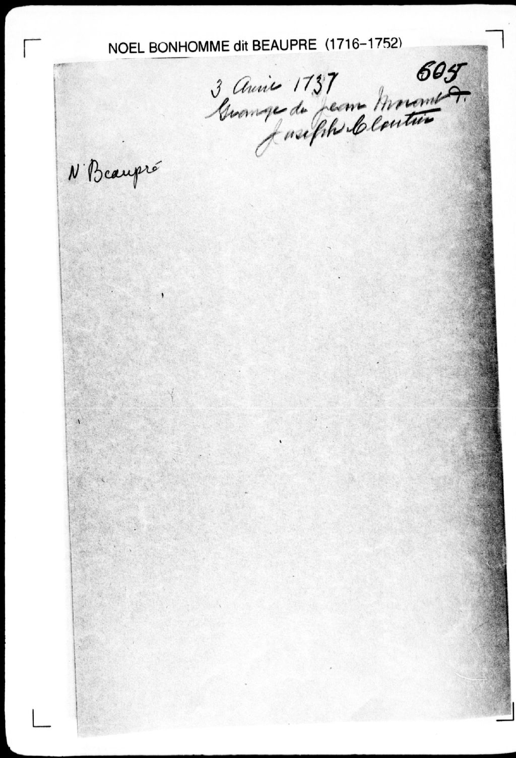 Accord et convention quant à une grange bâtie sur la terre d'une des parties, laquelle grange leur servira en communauté. La présente pièce concerne directement: Jean Morant (Morand); Joseph Cloutier (arpenteur Noël Bonhomme dit Beaupré), 3 avril 1737, Archives nationales à Québec, Fonds Cour supérieure. District judiciaire de Québec. Greffes d'arpenteurs, (03Q,CA301,S2,P650).