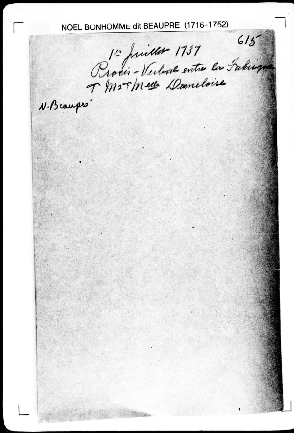 La pièce se compose du procès-verbal de chaînage d'un terrain et de lignes et bornes le séparant d'avec les terres voisines, lequel terrain étant situé près du jardin du gouverneur de la Nouvelle-France, près du Mont-Carmel et du château Saint-Louis, sur la rue des Grisons et la rue du Mont-Carmel dans la [Haute-Ville de Québec]. Elle concerne directement: la fabrique de la paroisse Notre-Dame-de-Québec; l'église de la paroisse Notre-Dame-de-Québec; Jacques Pagée dit Quercy (Pagé dit Carcy, Quarcy), ancien marguillier en charge de l'église cathédrale de Notre-Dame-de-Québec et fondé de pouvoir des marguilliers en charge; Nicolas-Marie Regneau (Renaud), écuyer, seigneur de Desmeloise (de Méloise) et de Neuville, capitaine, frère de Jeanne De Méloise; Jeanne Desmeloise (Des Méloises, de Méloise), soeur de Nicolas-Marie Renaud de Méloise; Pierre Le Vasseur (LeVasseur).