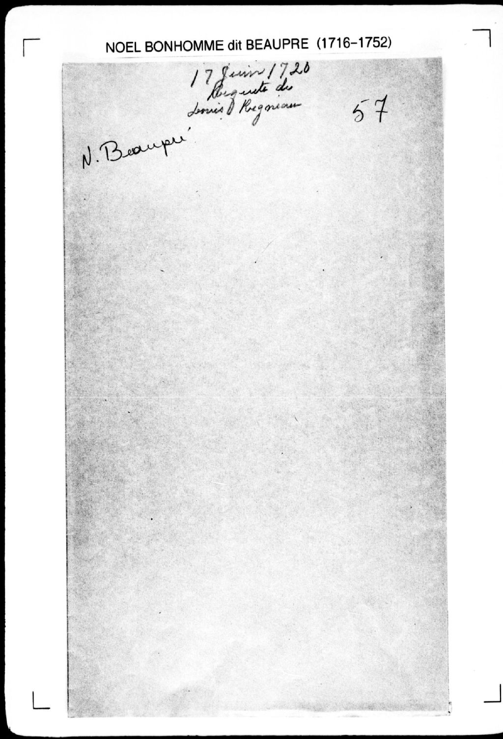 Procès-verbal de ligne et bornes séparant deux terres situées sur le bord du ruisseau de Sainte-Barbe. La présente pièce concerne directement: Louis Regneaux (Regnault, Renaud); le sieur Senregret (Sansregret) (arpenteur Noël Bonhomme dit Beaupré), 17 juin 1720, Archives nationales à Québec, Fonds Cour supérieure. District judiciaire de Québec. Greffes d'arpenteurs, (03Q,CA301,S2,P67).