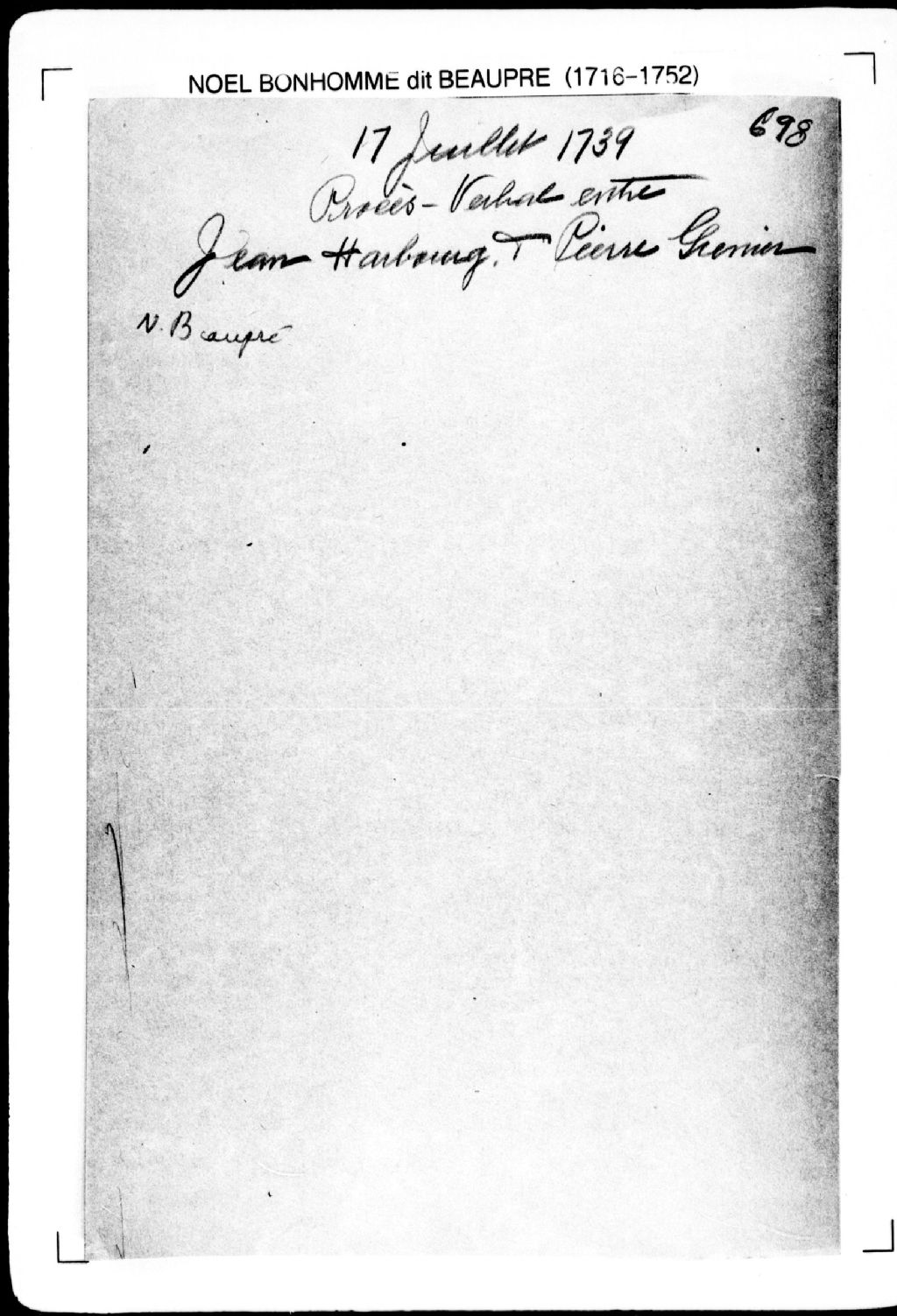 Procès-verbal de ligne séparant deux terres situées à partir du fleuve Saint-Laurent, depuis le chemin du village, dans la seigneurie de Neuville. La présente pièce concerne directement: Jean Arbourd (Arbour, Harbour); Pierre Grenier (arpenteur Noël Bonhomme dit Beaupré), 17 juillet 1739, Archives nationales à Québec, Fonds Cour supérieure. District judiciaire de Québec. Greffes d'arpenteurs, (03Q,CA301,S2,P743).