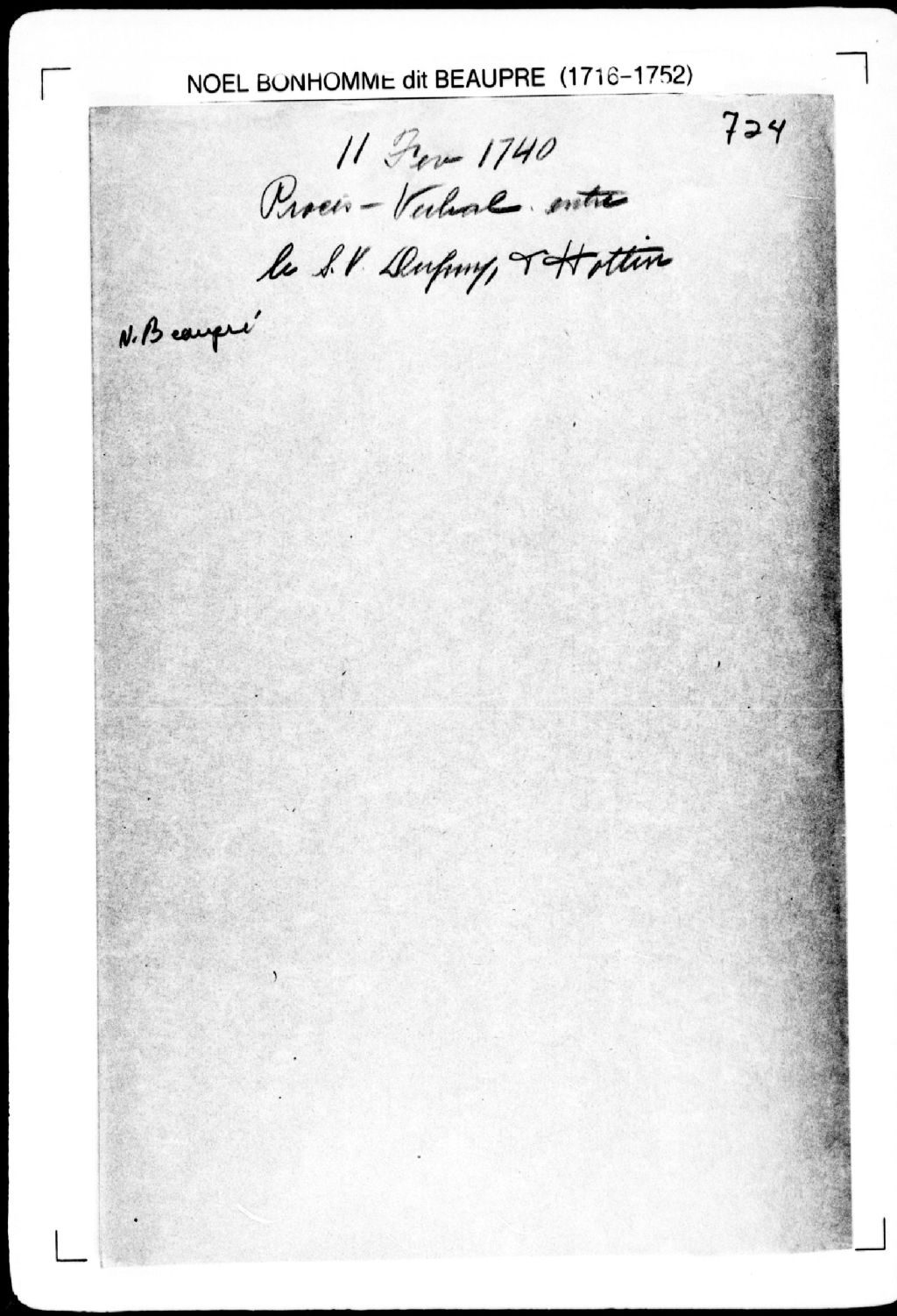 Procès-verbal de ligne et bornes séparant deux terres situées à la Grande-Anse, [seigneurie de La Pocatière]. La présente pièce concerne directement: Jérôme Dupuy (Dupuis); Joseph Hottin (Hotin, Autin) (arpenteur Noël Bonhomme dit Beaupré), 11 février 1740, Archives nationales à Québec, Fonds Cour supérieure. District judiciaire de Québec. Greffes d'arpenteurs, (03Q,CA301,S2,P769).