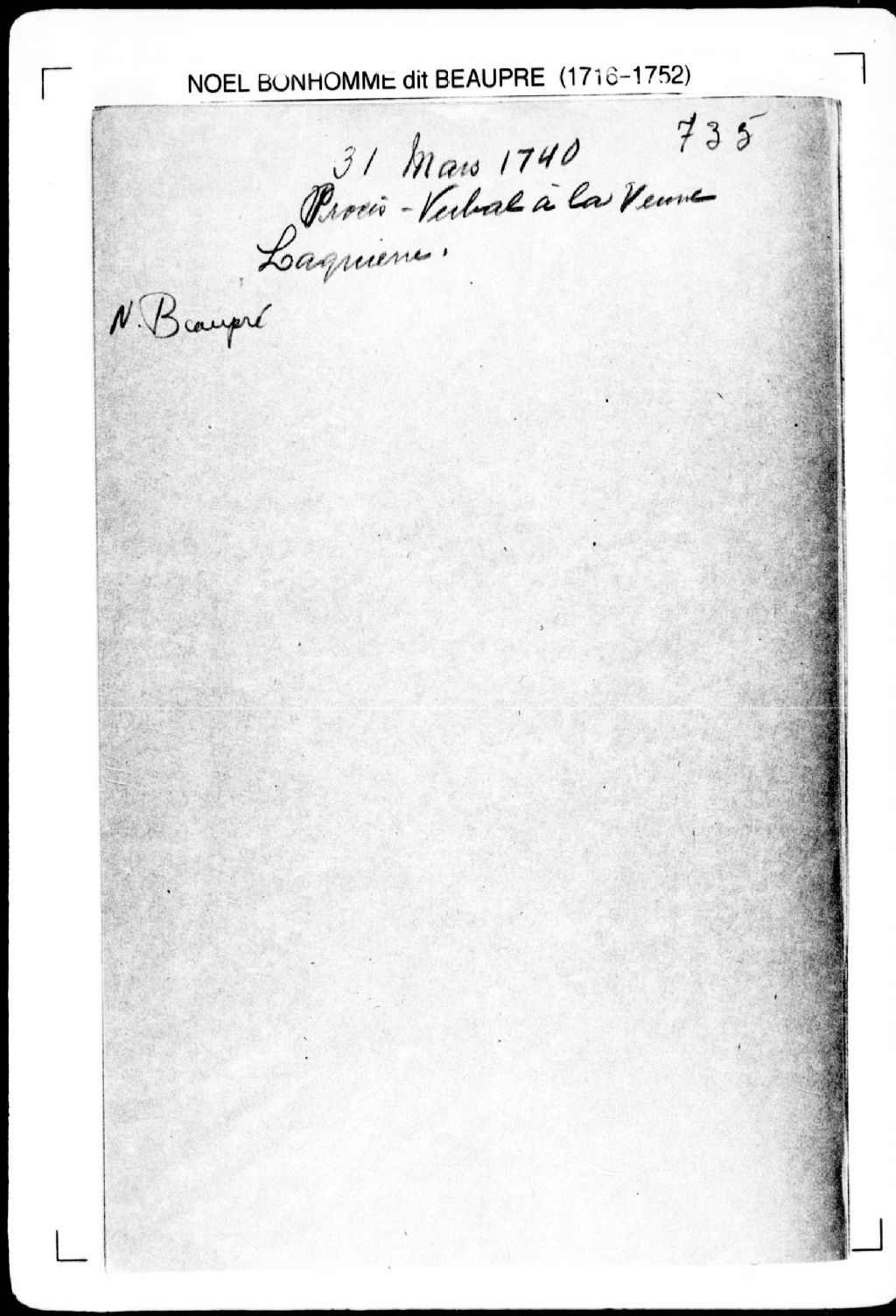 Procès-verbal de lignes et bornes d'une terre située à la rivière Sainte-Anne, seigneurie de Sainte-Anne-de-la-Pérade. La présente pièce concerne directement: la veuve Laquierre (Laquerre) (arpenteur Noël Bonhomme dit Beaupré), 31 mars 1740, Archives nationales à Québec, Fonds Cour supérieure. District judiciaire de Québec. Greffes d'arpenteurs, (03Q,CA301,S2,P780).