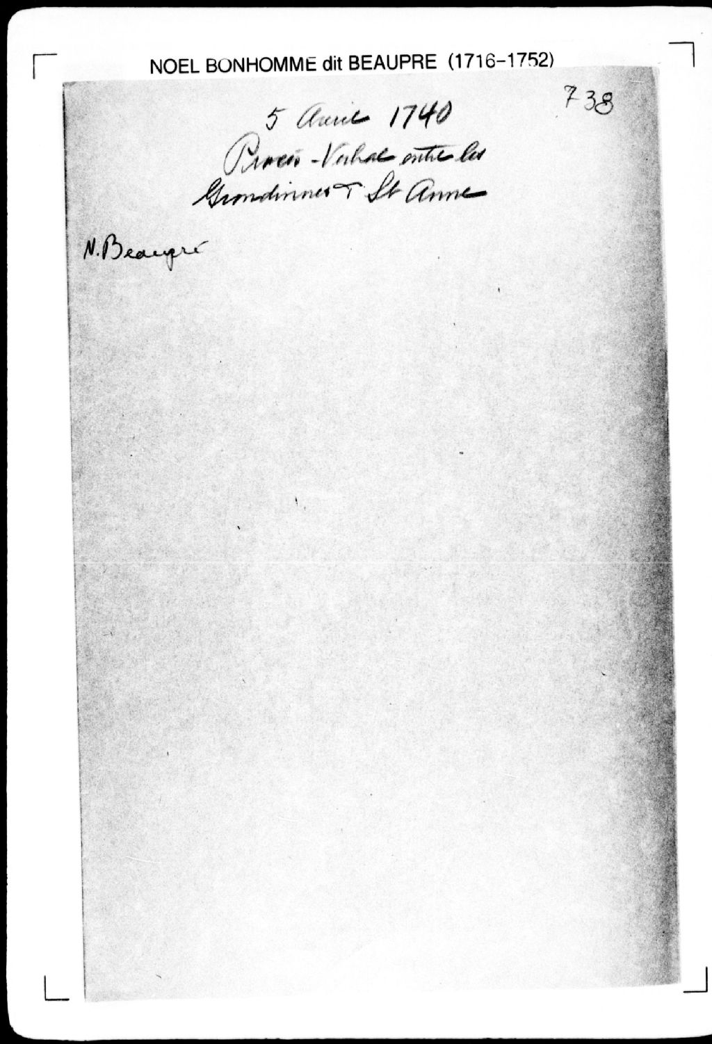 Procès-verbal de ligne séparant la seigneurie de Sainte-Anne-de-la-Pérade et la seigneurie des Grondines, à la rivière Sainte-Anne. La présente pièce concerne directement: le sieur de la Pérade (LaPérade), lieutenant d'une compagnie du détachement de la Marine et seigneur de Sainte-Anne-[de-la-Pérade]; François Hamelin dit Grondines, seigneur des Grondines; Louis Hamelin, seigneur des Grondines (arpenteur Noël Bonhomme dit Beaupré), 5 avril 1740, Archives nationales à Québec, Fonds Cour supérieure. District judiciaire de Québec. Greffes d'arpenteurs, (03Q,CA301,S2,P783).