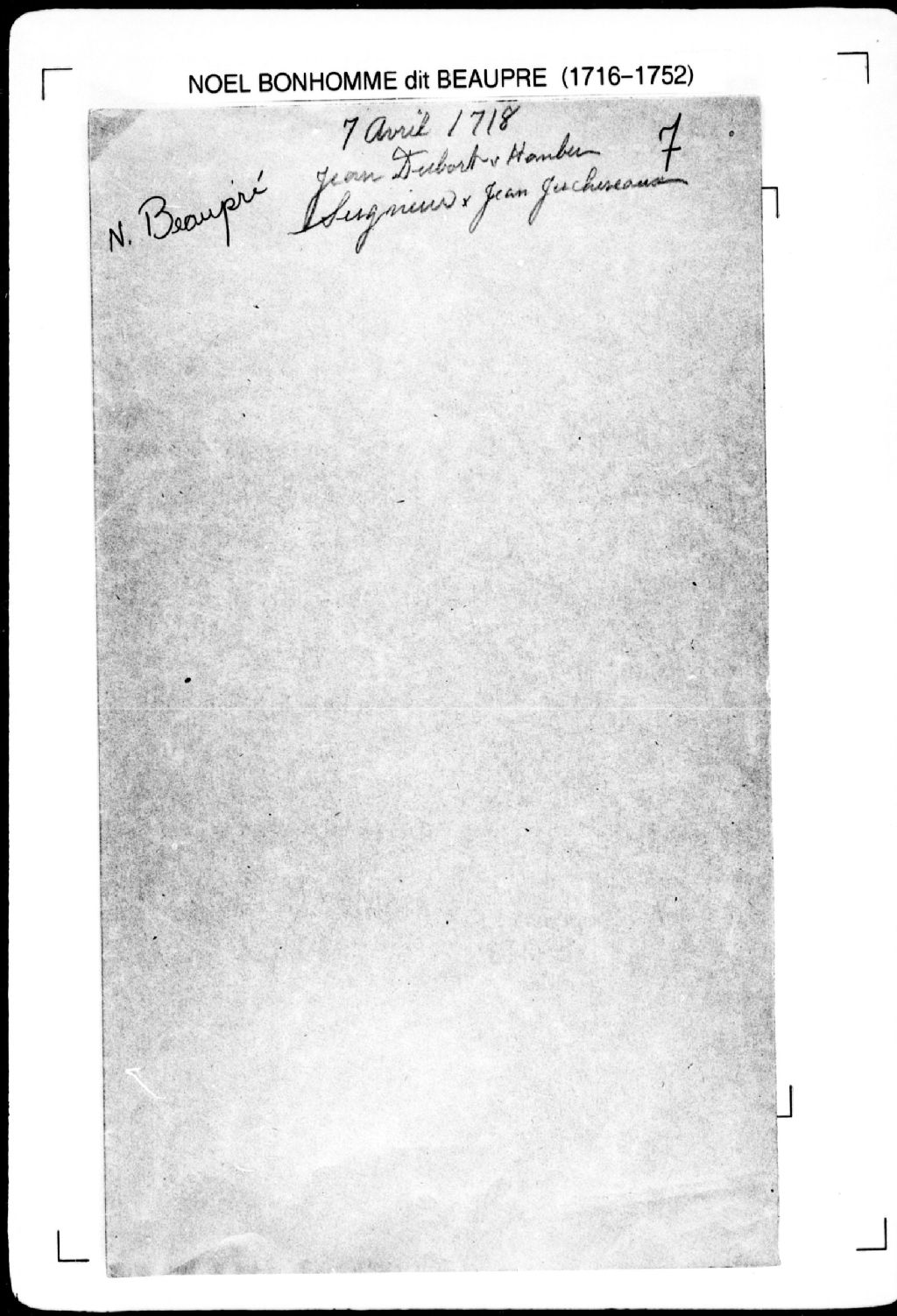 Procès-verbal de chaînage, lignes et bornes de cinq terres situées à la rivière de Roche (Desroches), sur le bord du fleuve Saint-Laurent, depuis la ligne séparant la seigneurie de Dombourg d'avec celle de Maur, seigneurie de Maur. La présente pièce concerne directement: le feu nommé Gillebert (Gilbert); Louis Dorre (Doré), frère d'Étienne Doré; le sieur Constantin; Pierre Vallière (l'aîné); Jean Guernier (Garnier, Grenier) (arpenteur Noël Bonhomme dit Beaupré), 7 avril 1718, Archives nationales à Québec, Fonds Cour supérieure. District judiciaire de Québec. Greffes d'arpenteurs, (03Q,CA301,S2,P8).