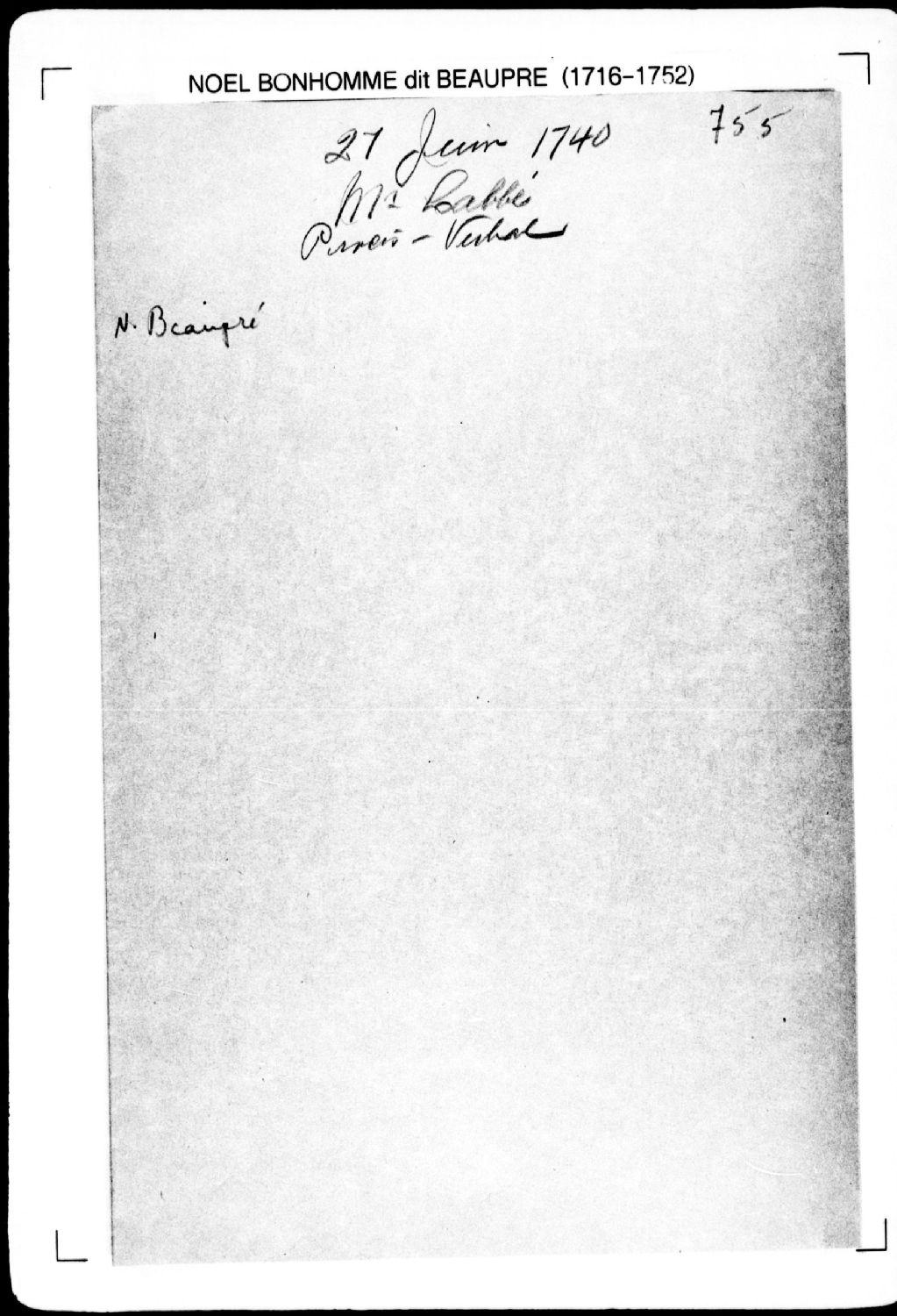 Procès-verbal de chaînage d'une terre et de ligne et bornes la séparant de la terre voisine, laquelle terre étant située à la Nouvelle-Beauce, sur la rivière du bras de Saguigan (Sartigan), [seigneurie de Fleury] [seigneurie de Saint-Joseph-de-Beauce]. La présente pièce concerne directement: le sieur Labreque (Labrecque); le sieur Porneuf (Portneuf) (arpenteur Noël Bonhomme dit Beaupré), 27 juin 1740, Archives nationales à Québec, Fonds Cour supérieure. District judiciaire de Québec. Greffes d'arpenteurs, (03Q,CA301,S2,P802).