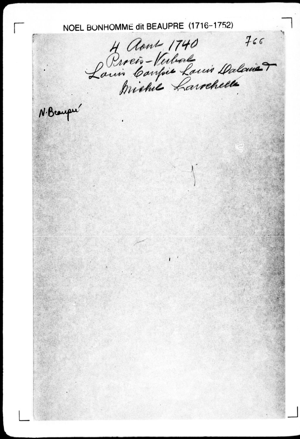 Procès-verbal de chaînage, lignes et bornes de trois terres situées au troisième rang de la [seigneurie de Saint-Michel]. La présente pièce concerne directement: Louis Dalaire (Dallaire, Allaire); Michel Larochelle; Louis Coupille (Coupil, Goupil) (arpenteur Noël Bonhomme dit Beaupré), 4 août 1740, Archives nationales à Québec, Fonds Cour supérieure. District judiciaire de Québec. Greffes d'arpenteurs, (03Q,CA301,S2,P813).