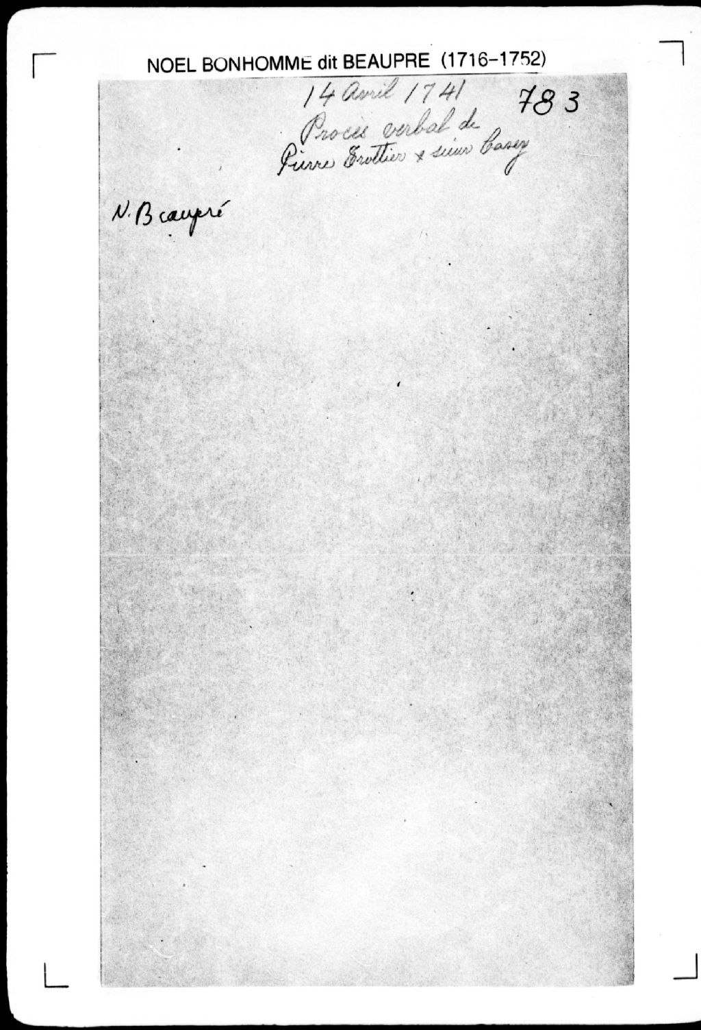 Procès-verbal de chaînage, lignes et bornes de trois terres situées dans la seigneurie de la Rivière-du-Loup (Maskinongé). La présente pièce concerne directement: Jean-Baptiste Lesage; le sieur Carcy (Quercy, Quarcy); Pierre Trottier (arpenteur Noël Bonhomme dit Beaupré), 14 avril 1741, Archives nationales à Québec, Fonds Cour supérieure. District judiciaire de Québec. Greffes d'arpenteurs, (03Q,CA301,S2,P830).