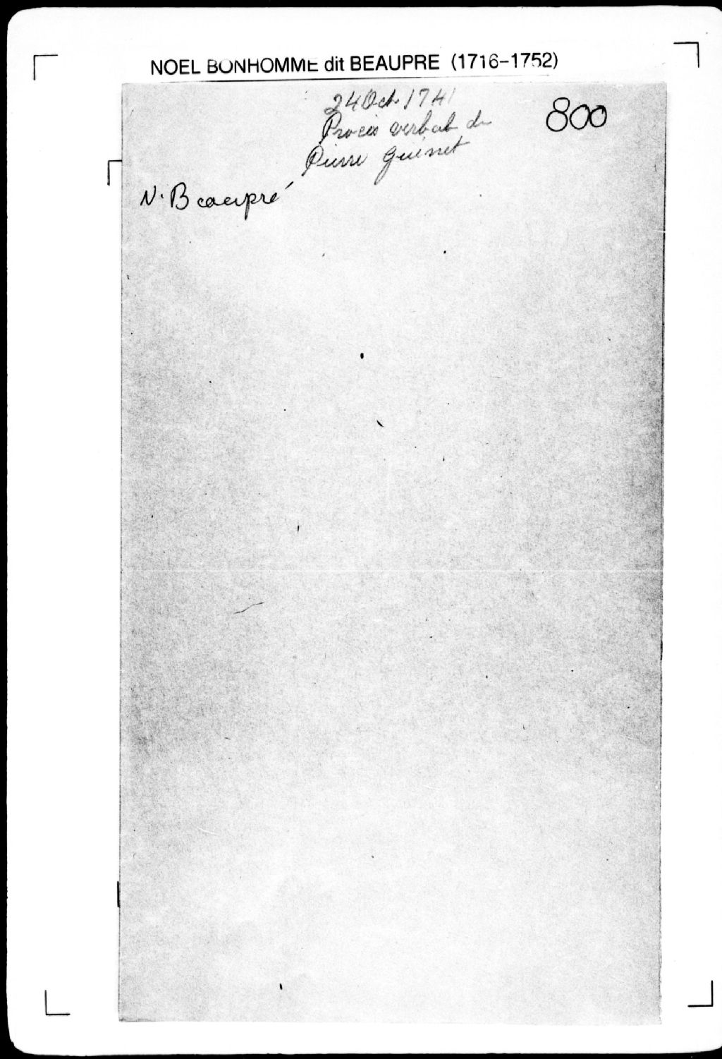 Procès-verbal de chaînage, lignes et bornes de deux terres situées au-dessus de la rivière Boyer, attenant à la ligne seigneuriale, au second rang de la seigneurie de Beaumont. La présente pièce concerne directement: Pierre Guénet; Antoine Gontier (Gonthier) (arpenteur Noël Bonhomme dit Beaupré), 24 octobre 1741, Archives nationales à Québec, Fonds Cour supérieure. District judiciaire de Québec. Greffes d'arpenteurs, (03Q,CA301,S2,P847).