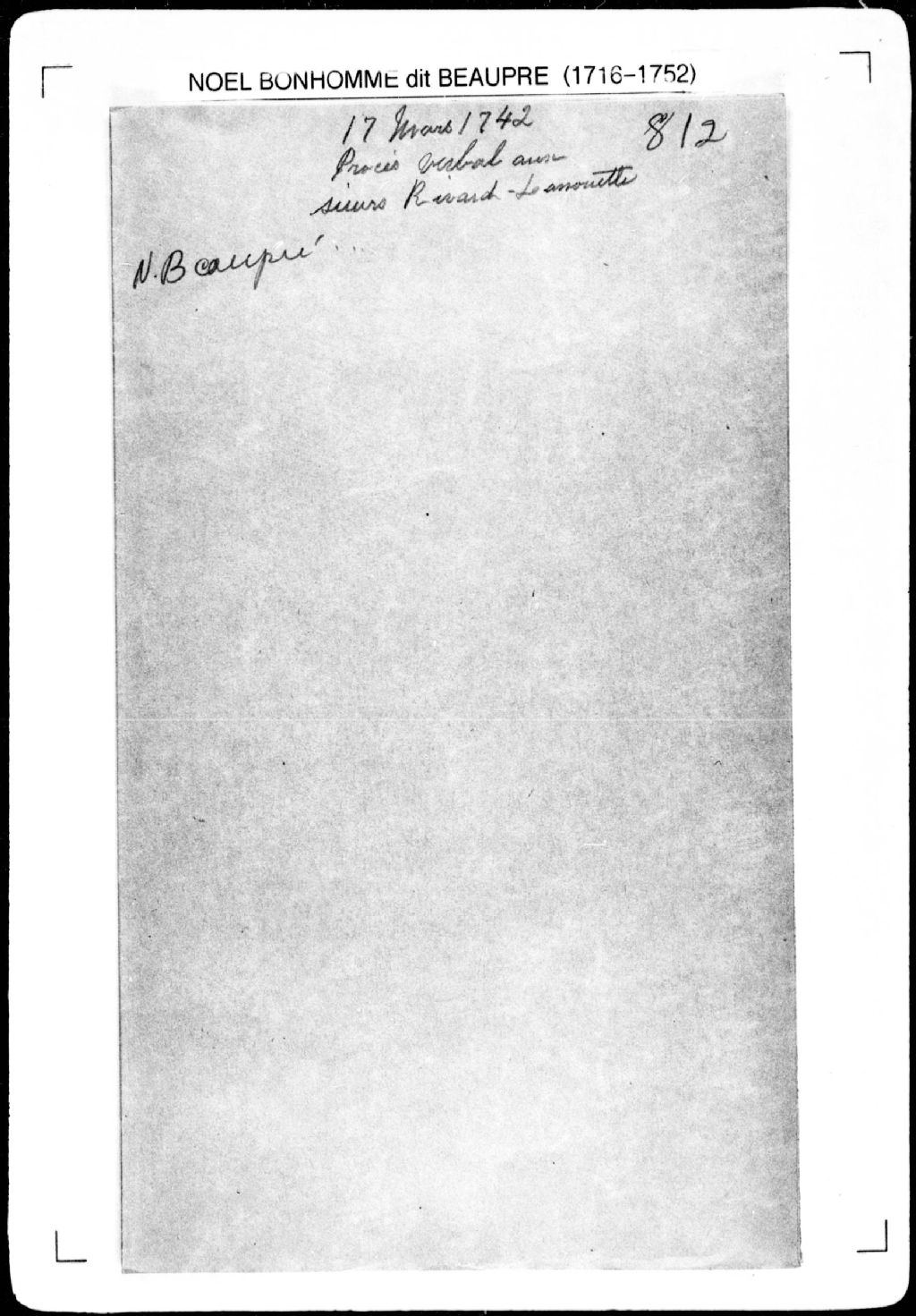 Procès-verbal de ligne et bornes d'une terre située dans la seigneurie Sainte-Anne-[de-la-Pérade]. La présente pièce concerne directement: Julien Rivard Lanouette (arpenteur Noël Bonhomme dit Beaupré), 17 mars 1742, Archives nationales à Québec, Fonds Cour supérieure. District judiciaire de Québec. Greffes d'arpenteurs, (03Q,CA301,S2,P860).