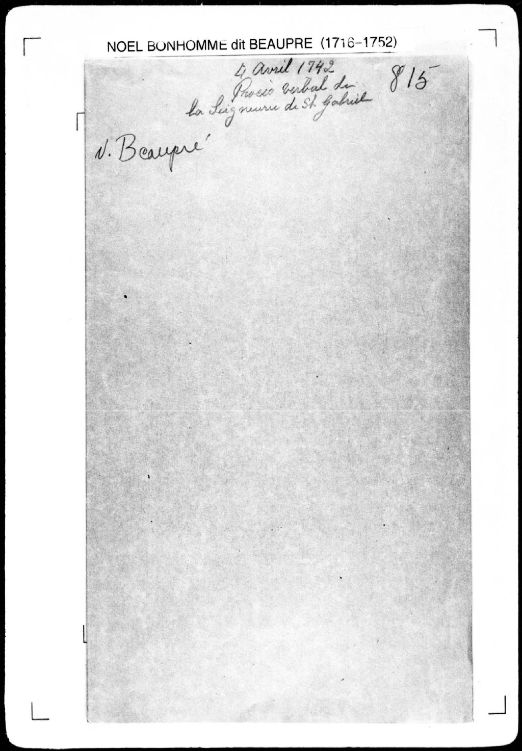 Procès-verbal de chaînage du front de la seigneurie de Saint-Gabriel entre les seigneuries de [Gaudarville] et de [Saint-Ignace]. La présente pièce concerne directement: les Révérends Pères Jésuites du Collège de Québec (arpenteur Noël Bonhomme dit Beaupré), 4 avril 1742, Archives nationales à Québec, Fonds Cour supérieure. District judiciaire de Québec. Greffes d'arpenteurs, (03Q,CA301,S2,P864).