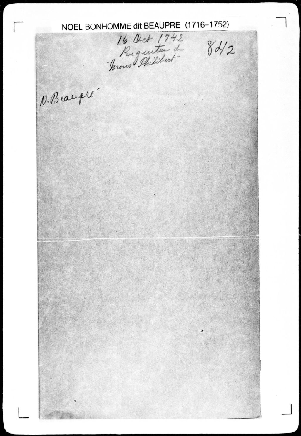 Procès-verbal de ligne séparant deux terres situées dans la seigneurie du Cap-Rouge [seigneurie de Gaudarville]. La présente pièce concerne directement: le sieur Philibert; la veuve Saint-Pierre (arpenteur Noël Bonhomme dit Beaupré), 16 octobre 1742, Archives nationales à Québec, Fonds Cour supérieure. District judiciaire de Québec. Greffes d'arpenteurs, (03Q,CA301,S2,P892).