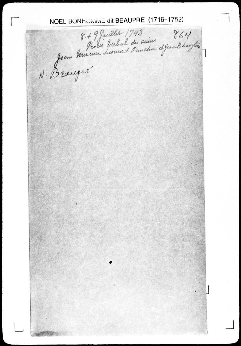 Procès-verbal de chaînage, ligne et bornes de la profondeur des terres d'une concession de la seigneurie de la Pointe-aux-Trembles [seigneurie de Neuville]. La présente pièce concerne directement: Jean-Baptiste Langlois; Léonard Fauché (Faucher); Jean Mercure; Noël Peltier (fils) (Pelletier); le nommé Saint-Morice (Saint-Maurice); Noël Peltier (Pelletier); les nommés Bois-Joly (Boisjoly); Jacques Jyrardin (Girardin) (arpenteur Noël Bonhomme dit Beaupré), 8 juillet 1743 - 9 juillet 1743, Archives nationales à Québec, Fonds Cour supérieure. District judiciaire de Québec. Greffes d'arpenteurs, (03Q,CA301,S2,P915).