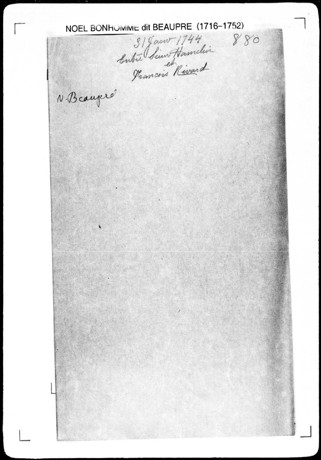 Procès-verbal de ligne et bornes séparant deux terres situées dans la seigneurie des Grondines. La présente pièce concerne directement: François Rivard dit Montendre; Joseph-Marie Hamelin (arpenteur Noël Bonhomme dit Beaupré), 31 janvier 1744, Archives nationales à Québec, Fonds Cour supérieure. District judiciaire de Québec. Greffes d'arpenteurs, (03Q,CA301,S2,P932).