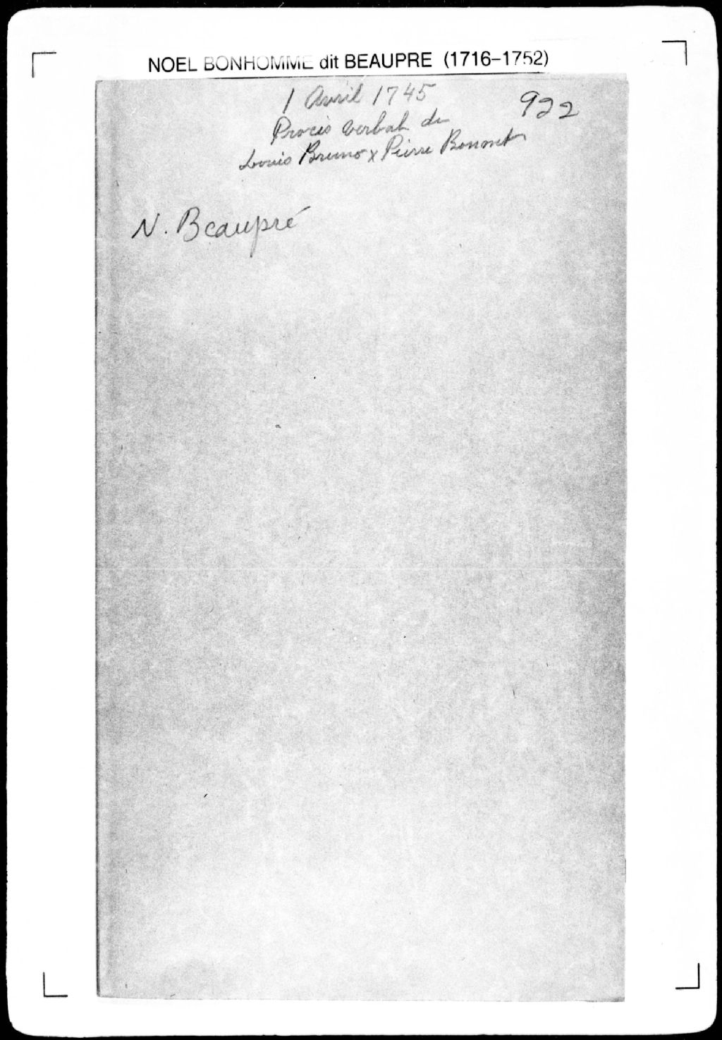 Procès-verbal de livraison de terres et de chaînage, lignes et bornes de quatre terres, lesquelles terres étant situées dans la seigneurie de la Chevrotière et dans la seigneurie des Grondines. La présente pièce concerne directement: Joseph Merant (Mérand); Pierre Brunet; la veuve Merant (Mérand); le sieur Bruno (Bruneau) (arpenteur Noël Bonhomme dit Beaupré), 1er avril 1745, Archives nationales à Québec, Fonds Cour supérieure. District judiciaire de Québec. Greffes d'arpenteurs, (03Q,CA301,S2,P973).