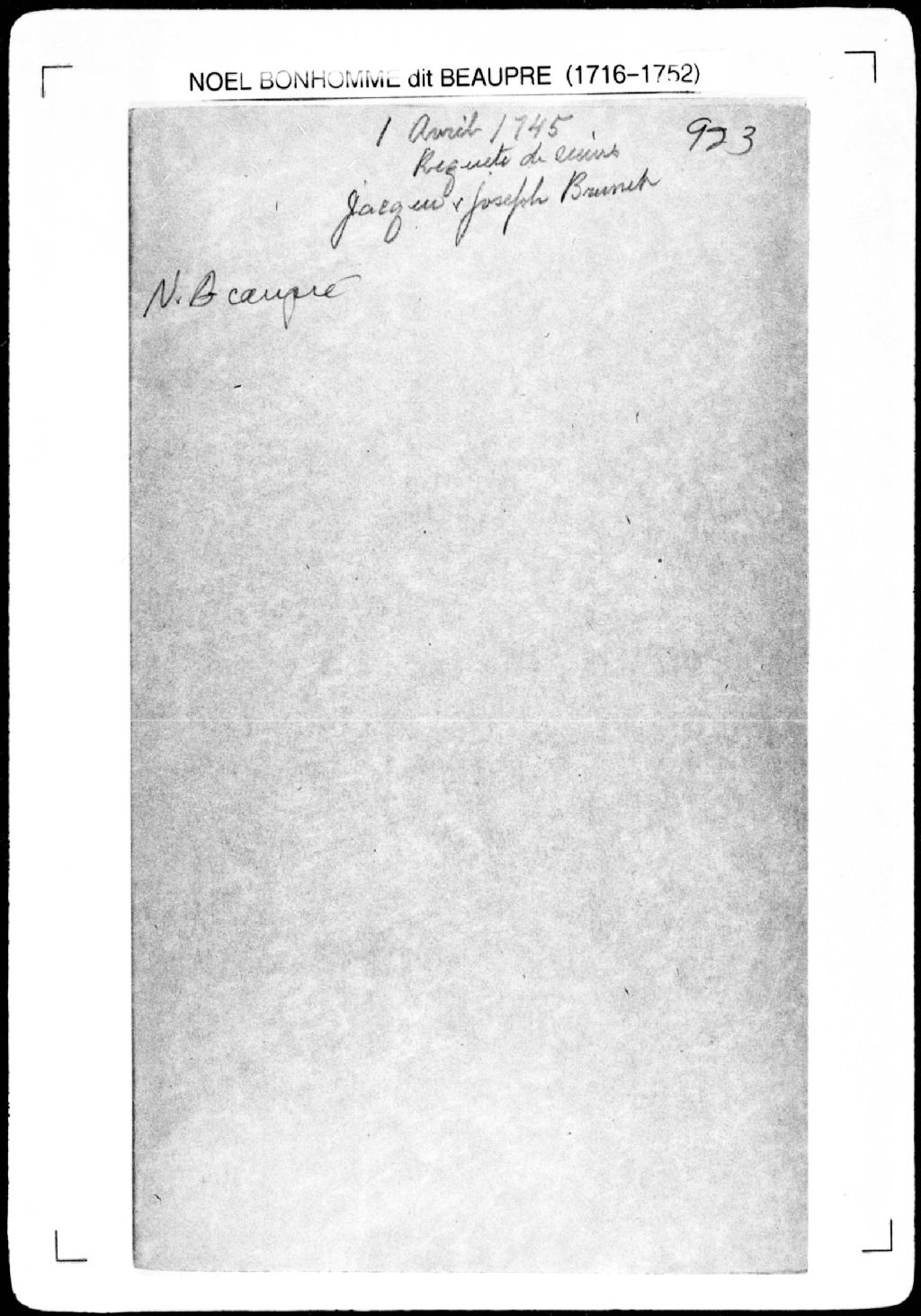 Procès-verbal de ligne et bornes séparant deux terres situées dans la seigneurie des Grondines. La présente pièce concerne directement: Jacques Brunet, frère de Joseph Brunet et de Pierre Brunet; Joseph Brunet, frère de Jacques Brunet et Pierre Brunet (arpenteur Noël Bonhomme dit Beaupré), 1er avril 1745, Archives nationales à Québec, Fonds Cour supérieure. District judiciaire de Québec. Greffes d'arpenteurs, (03Q,CA301,S2,P974).