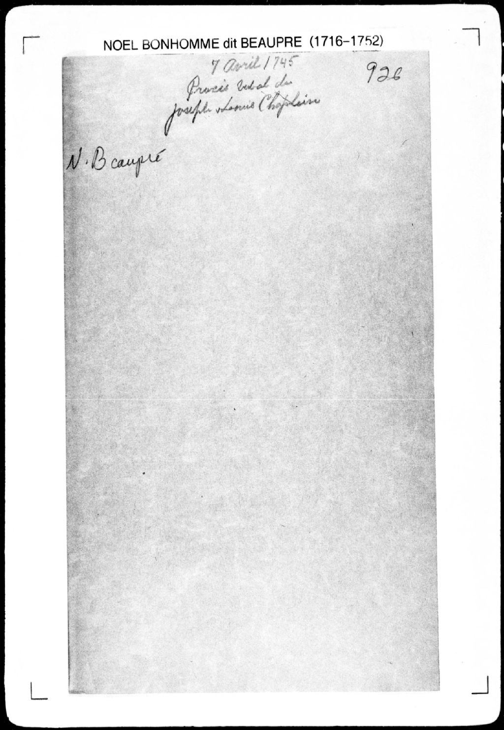 Procès-verbal de partage d'une terre et de chaînage et borne des portions, laquelle terre étant située dans la seigneurie de La Chevrotière. La présente pièce concerne directement: Louis Chaplain (Chapelain); Joseph Chaplain (Chapelain) (arpenteur Noël Bonhomme dit Beaupré), 7 avril 1745, Archives nationales à Québec, Fonds Cour supérieure. District judiciaire de Québec. Greffes d'arpenteurs, (03Q,CA301,S2,P977).