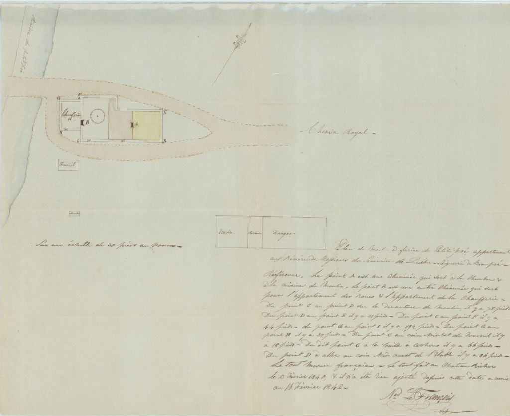 Sur ces plans du moulin à farine du Petit Pré pour le Séminaire de Québec et situé dans la paroisse de Château-Richer dans la seigneurie de la Côte-de-Beaupré figurent la rivière du Petit Pré, le chemin Royal, les bâtiments, le fournil, la chaufferie pour sécher le grain et le nom Messieurs du Séminaire de Québec