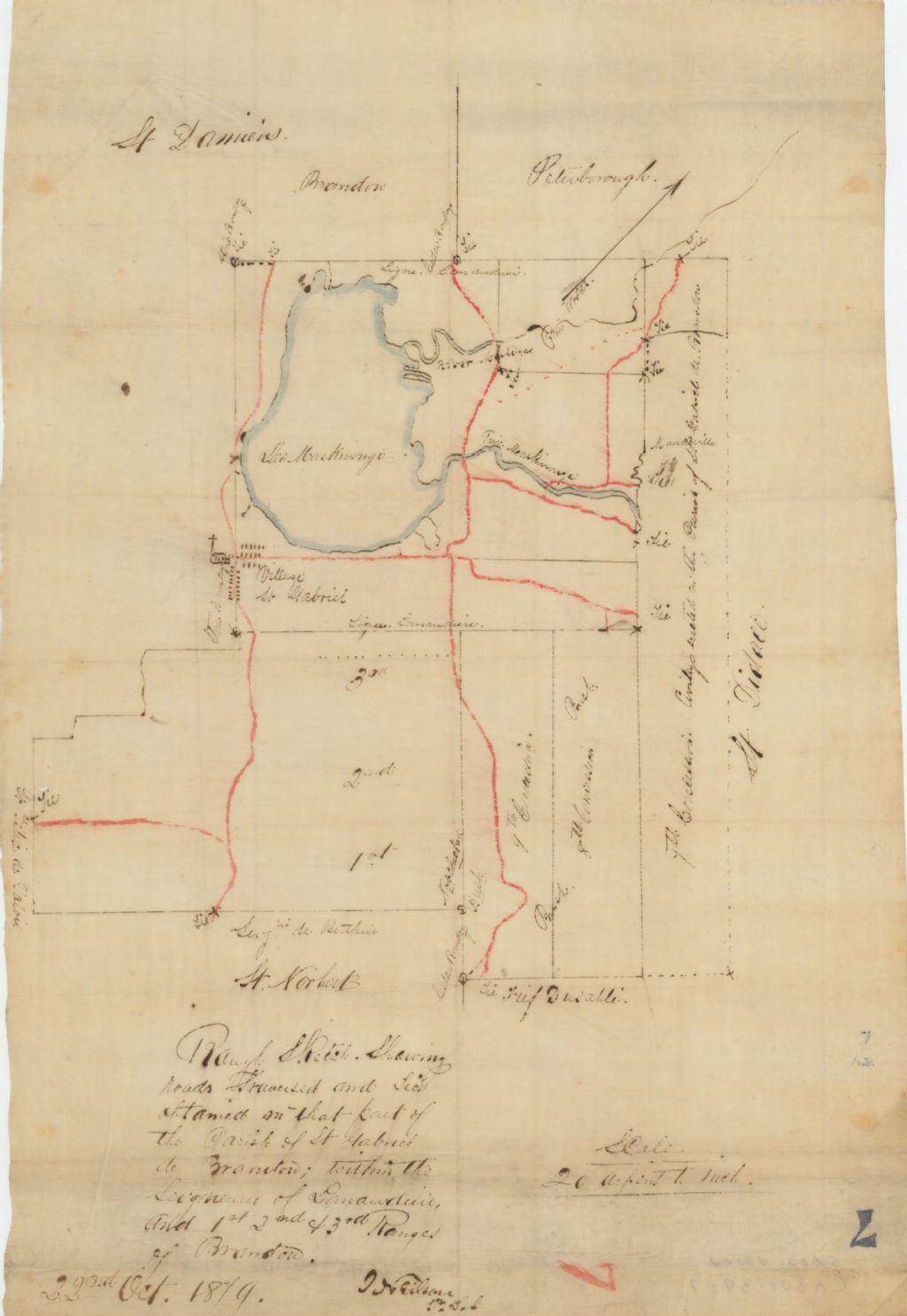 Sketch showing roads traversed and ties obtained on that part of the parish of St Gabriel de Brandon within the seigniory of Lanaudière and 1st, 2nd, 3rd ranges of Brandon