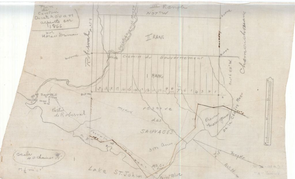 Sur ce plan du canton Ouiatchouan figurent une partie de ce canton, le lac Saint-Jean, le village de Pointe-Bleue, la rivière Ouiatchouan, la réserve amérindienne Mashteuiatsh, le numéro des lots, les moulins, les bâtiments et l'emplacement occupé par les Amérindiens