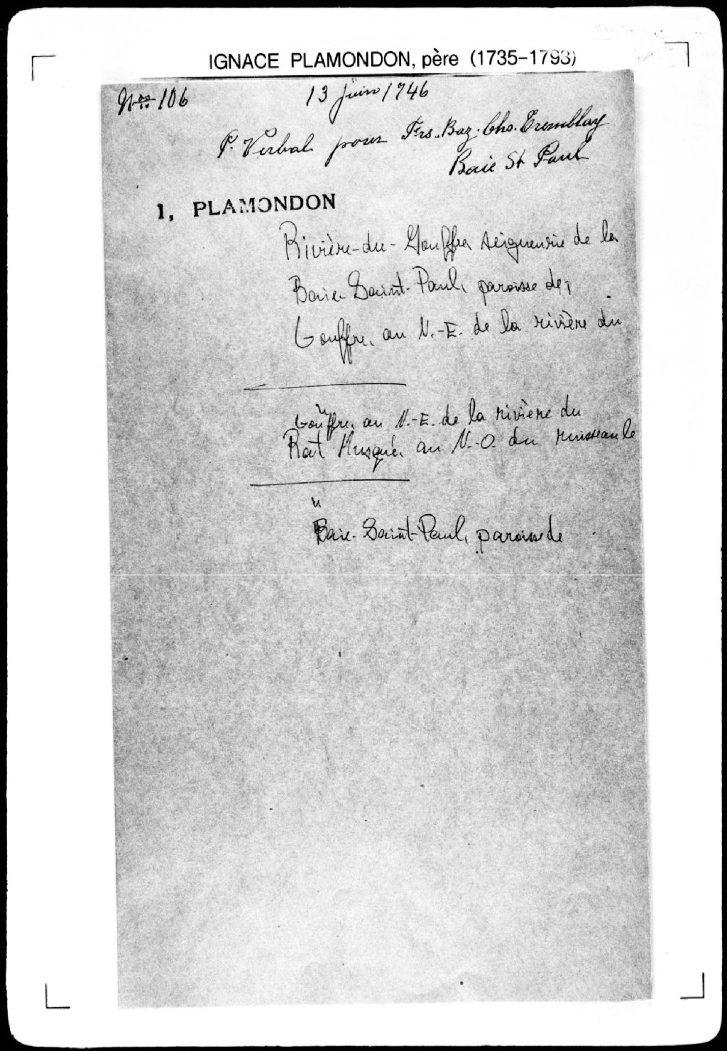 Procès-verbal de chaînage, ligne et bornes d'une terre située à la [Baie-Saint-Paul], dans la [seigneurie de la Rivière-du-Gouffre]. La présente pièce concerne directement: Jean Bouchard (arpenteur Ignace Plamondon père), 18 juin 1746, Archives nationales à Québec, Fonds Cour supérieure. District judiciaire de Québec. Greffes d'arpenteurs, (03Q,CA301,S43,P106-3).
