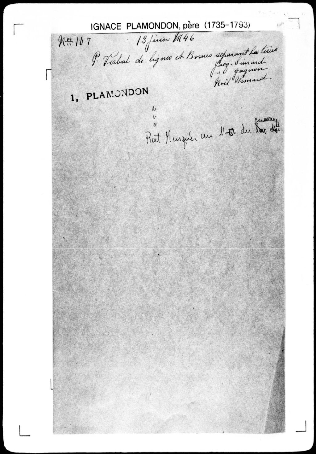 Procès-verbal de lignes et bornes séparant une terre d'avec les terres voisines, dont une non concédée, lesquelles terres étant situées au nord-est de la rivière du Gouffre et au nord-ouest du ruisseau du Rat-Musqué, à la Baie-Saint-Paul, dans la [seigneurie de la Rivière-du-Gouffre]. La présente pièce concerne directement: Jacques Simard, acquéreur en partie du fief de la [Rivière-du-Gouffre], fils de Noël Simard; le nommé Gagnay (Gagné) (arpenteur Ignace Plamondon père), 13 juin 1746, Archives nationales à Québec, Fonds Cour supérieure. District judiciaire de Québec. Greffes d'arpenteurs, (03Q,CA301,S43,P107).