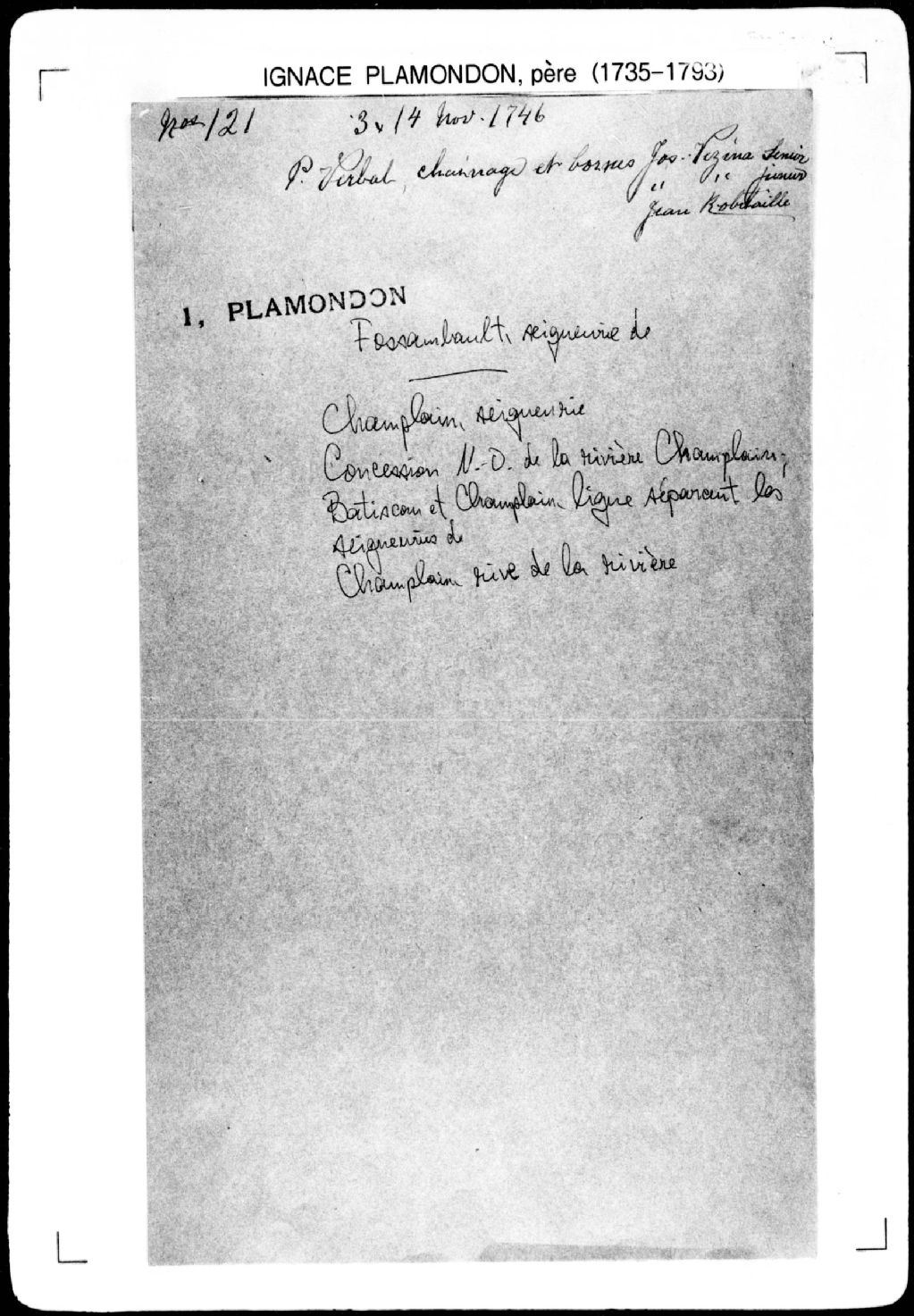 Procès-verbal de chaînage, lignes et bornes de trois terres situées dans la seigneurie de Fossambault. La présente pièce concerne directement: Joseph Vesinat (père) (Vézina); Jean Robitale (fils) (Robitaille); Joseph Vesinat (fils) (Vézina) (arpenteur Ignace Plamondon père), 3 novembre 1746, Archives nationales à Québec, Fonds Cour supérieure. District judiciaire de Québec. Greffes d'arpenteurs, (03Q,CA301,S43,P121-1).