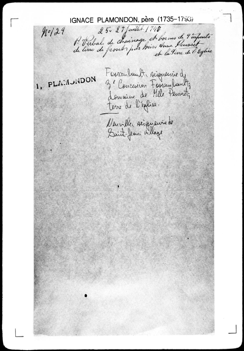 - Procès-verbal de chaînage, lignes et bornes de deux terres et d'une étendue de terre réservée pour le domaine de la seigneurie et pour l'église, lesquelles terres étant situées à la première concession, dans la seigneurie de Fossambault.