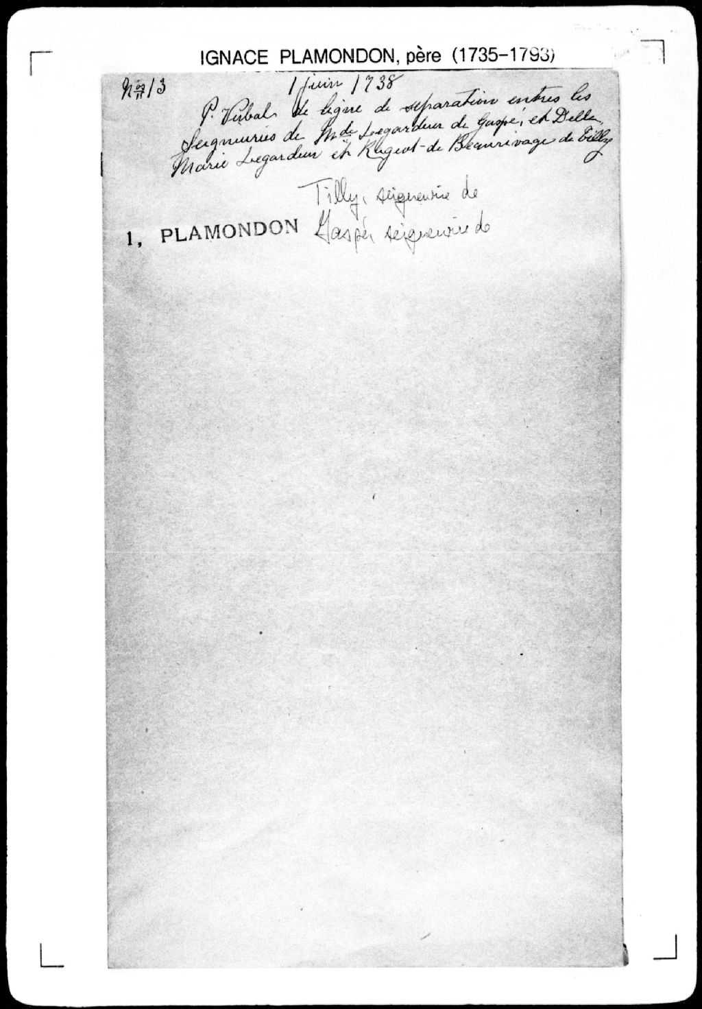 - La pièce se compose du procès-verbal de chaînage, lignes et bornes de trois seigneuries, à savoir la seigneurie de Tilly, la seigneurie de Gaspé et la seigneurie de Beaurivage [seigneurie de Saint-Gilles], lesquelles seigneuries étant attenantes au fief Bonsecours et au fief Maranda (seigneurie Duquet). Elle concerne directement: le sieur Ragote de Beaurivage (Rageot de Beauxrivages); la dame Legardeur de Gaspee (Le Gardeur de Gaspé); Marie-Françoise Legardeur (Le Gardeur) et sa mère.