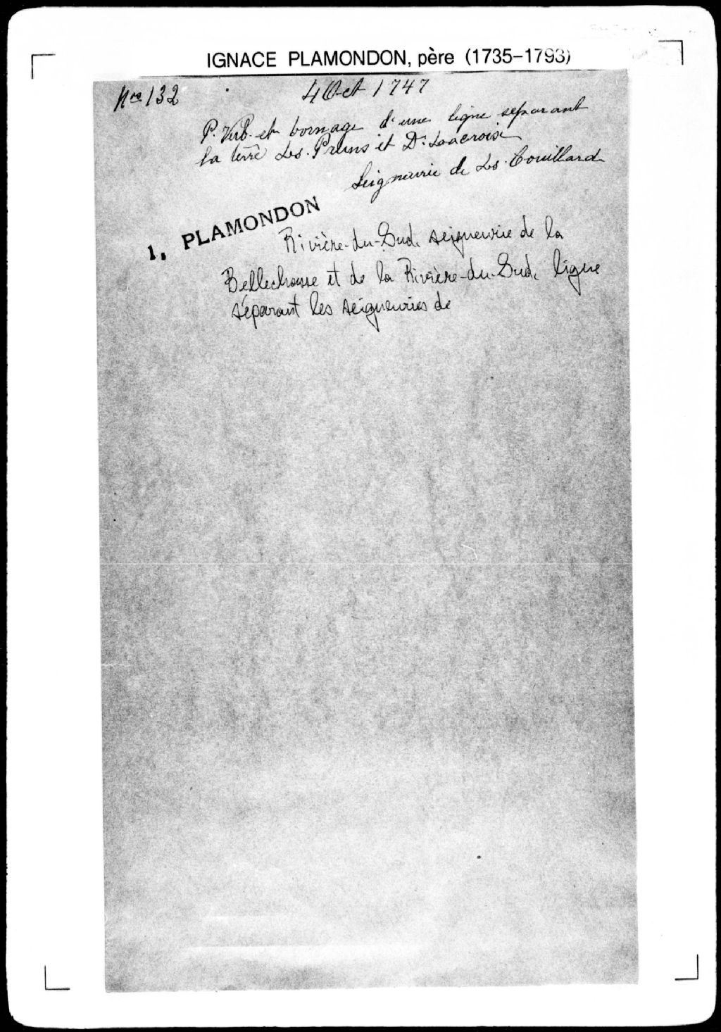 Procès-verbal de ligne séparant deux terres situées de part et d'autre de la ligne séparant la seigneurie de Bellechasse et la seigneurie de la Rivière-du-Sud. La présente pièce concerne directement: Louis Pruno (Pruneau), père de Louis Pruneau, de Pierre Pruneau et de Joseph Pruneau; le sieur Lacroix, chirurgien à Québec (arpenteur Ignace Plamondon père), 4 octobre 1747, Archives nationales à Québec, Fonds Cour supérieure. District judiciaire de Québec. Greffes d'arpenteurs, (03Q,CA301,S43,P132).
